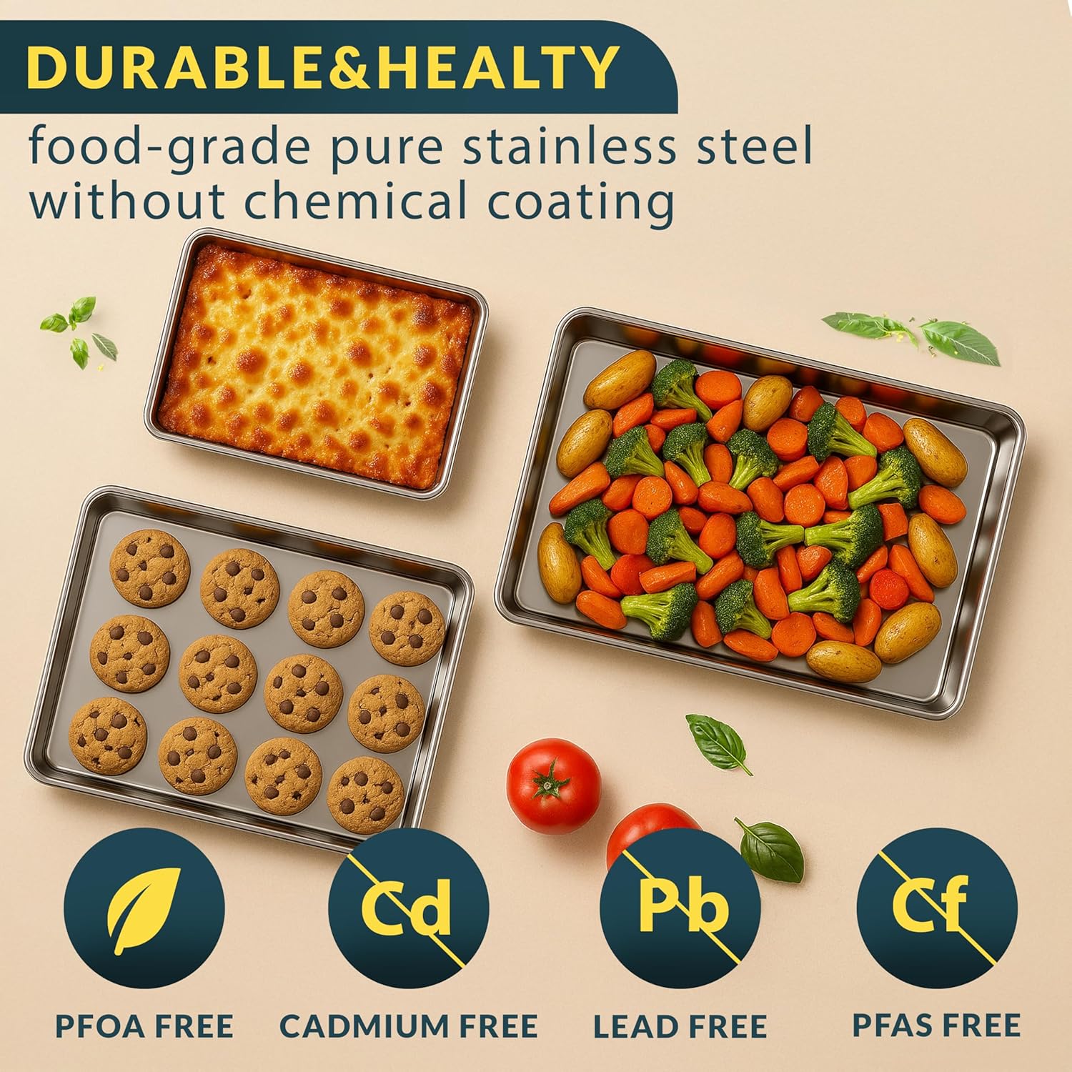 - PREMIUM STAINLESS STEEL MATERIAL: Crafted from food-grade stainless steel bakeware, these non toxic baking sheet pans are built to last. Mirror finish resists sticking, and rolled edges protect your hands.