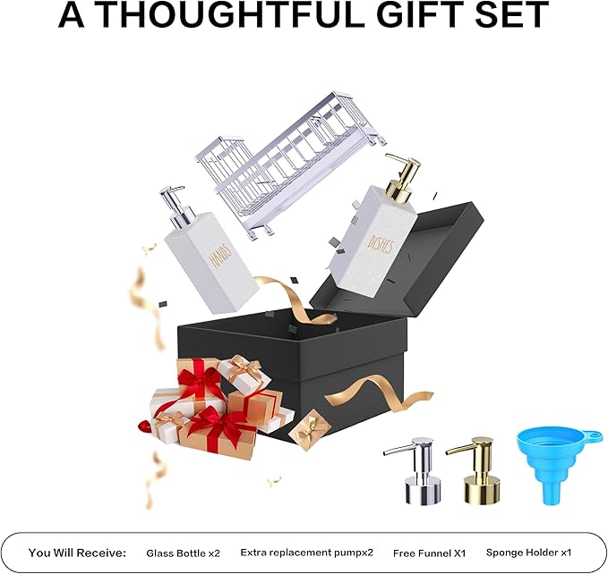 - Stainless Steel Sponge Holder + White Glass Bottle + Gold and Silver Rust-Proof Pump