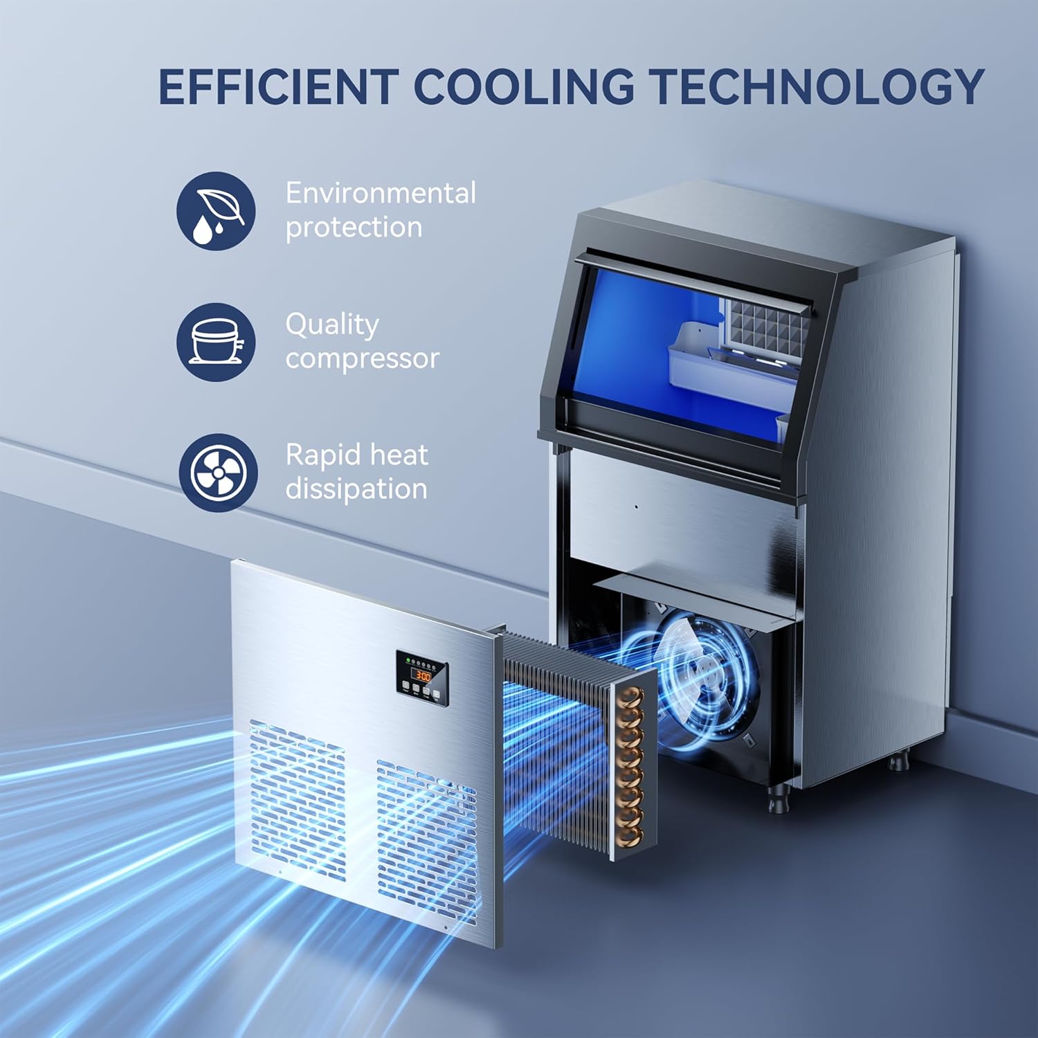 - Efficient & Quiet Ice Production: The ice maker commercial with a capacity of 45 ice cubes and up to 100 lbs of ice production per day, it fits perfectly in various settings like home, coffee shop, bar, etc. The 34 lbs storage capacity is also quite generous. Operates quietly, so you can enjoy cold refreshments without the disturbance of excessive noise.