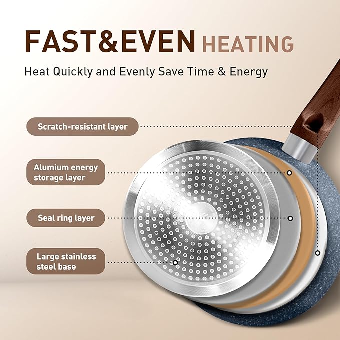 - ๐๐ฏ๐๐ง ๐๐๐๐ญ๐ข๐ง๐ ๐๐๐๐ก๐ง๐จ๐ฅ๐จ๐ ๐ฒ: Our pots and pans set is excluding of PFOS,PFOA, The set's even heating technology guarantees uniformly cooked meals. No more hot spots or unevenly cooked food โ every dish is a masterpiece. Nonstick pot set for precise cooking