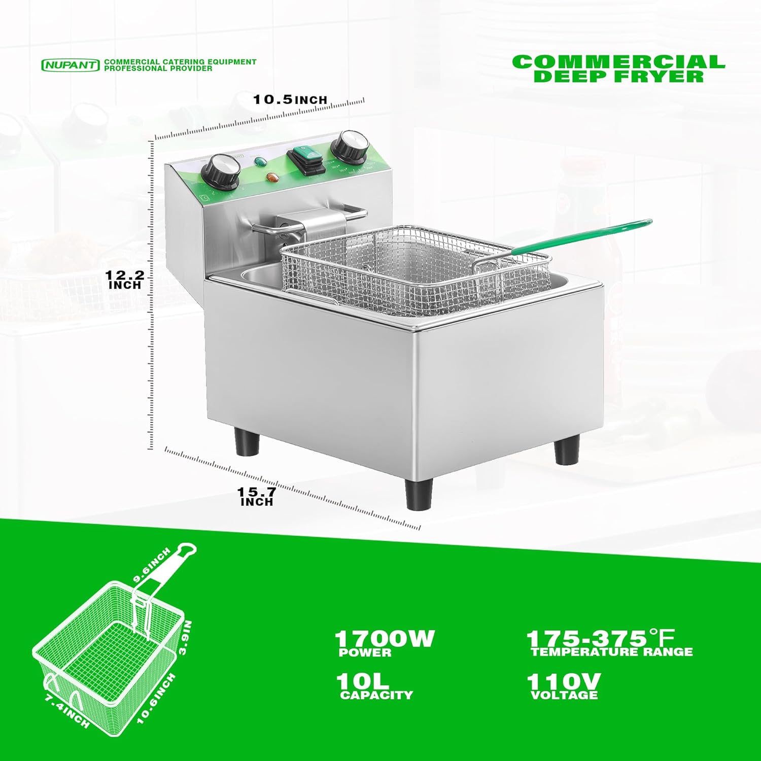Electric Deep Fryer with Timer 10L/10.6QT Commercial Deep Fryer with Basket and Lid, Temp Control, 1700W/110V Stainless Steel Single Oil Fryer Countertop Fryer for Home and Restaurant Use