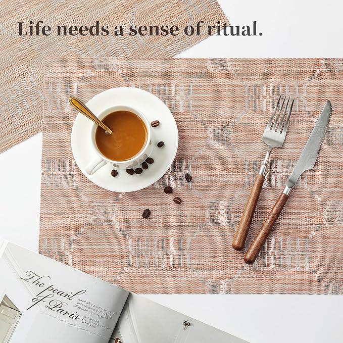 Leetaltree Coral Placemats Set of 6 - Heat Resistant Non-Slip Place mats for Dining Table, Washable Durable PVC Vinyl Woven Table Mats(Coral, 6)