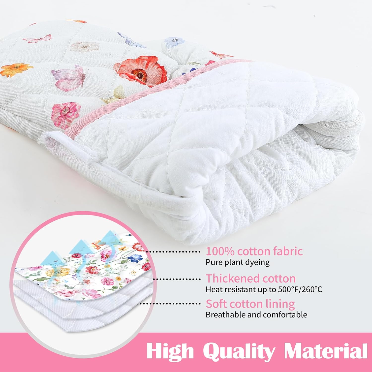- PREFERRED MATERIAL: Each pot holders & oven mitts set is carefully crafted from 100% cotton, with dyes sourced from plants, digital printing technology and upgraded color fixing process, the colors are bright and fade-resistant. Cotton lining to bring you comfortable and breathable touch and protect your skin as well.