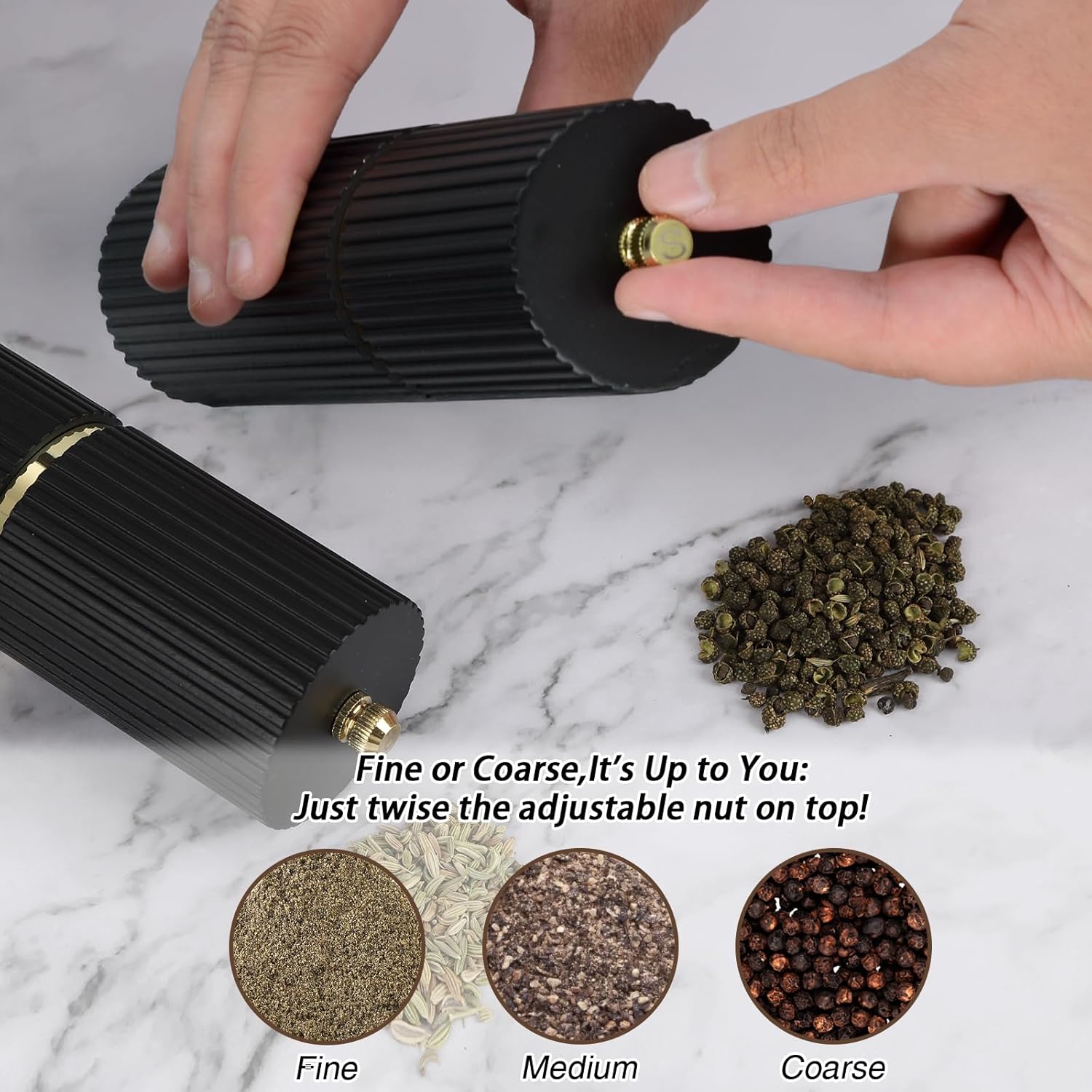 - Adjustable& Easy To Use: Each of our professional Pepper grinder manual, contains an efficient adjustable,It is easy to adjust by twisting the nut at the top of the pepper mill from loose to tight to get the desired spice fineness according to your needs, counter-clockwise for more coarse, clockwise for fine