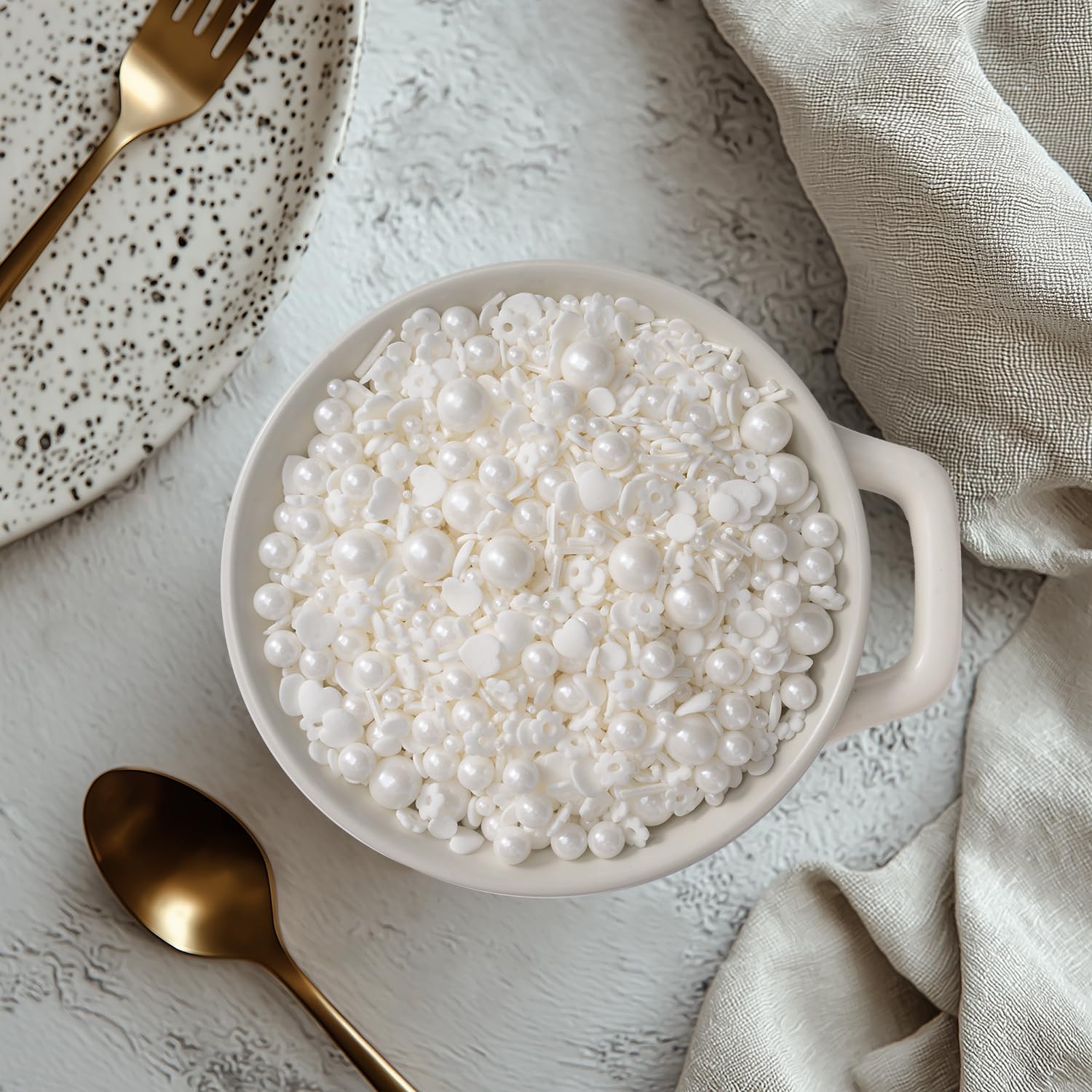White Lovers Sprinkles for Cake Decorating 4.23ounce - Sugar Mix Contains Heart & Flowers Pearl Sprinkles for Cupcake Toppers, Ice Cream, Candy, Cookie Decorations - Wedding Party Supplies