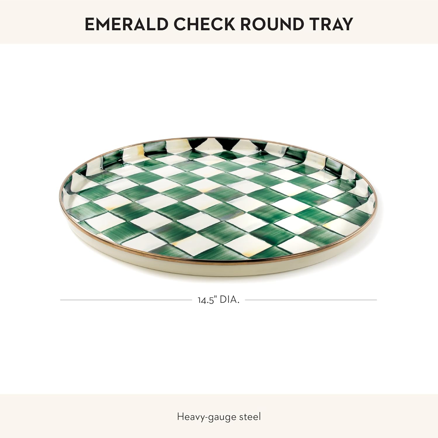 - ELEGANT SERVING ESSENTIAL: The Emerald Check round decorative tray features a sturdy steel base and an enchanting jewel-toned palette woven by an artisan’s brush through glossy hand-painted green-and-white checks.
