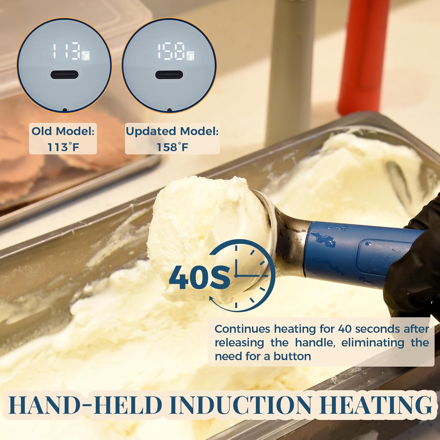 - [Effortless Hard Ice Cream Scooping] – No more bending spoons or waiting for ice cream to thaw. This heated ice cream scoop warms up quickly to 158°F, letting you glide through even rock-solid ice cream straight from the freezer. Just grip the handle to activate heating — no buttons required. It continues warming for 40 seconds after use, making every scoop smooth and simple. Perfect for ice cream, gelato, or frozen yogurt