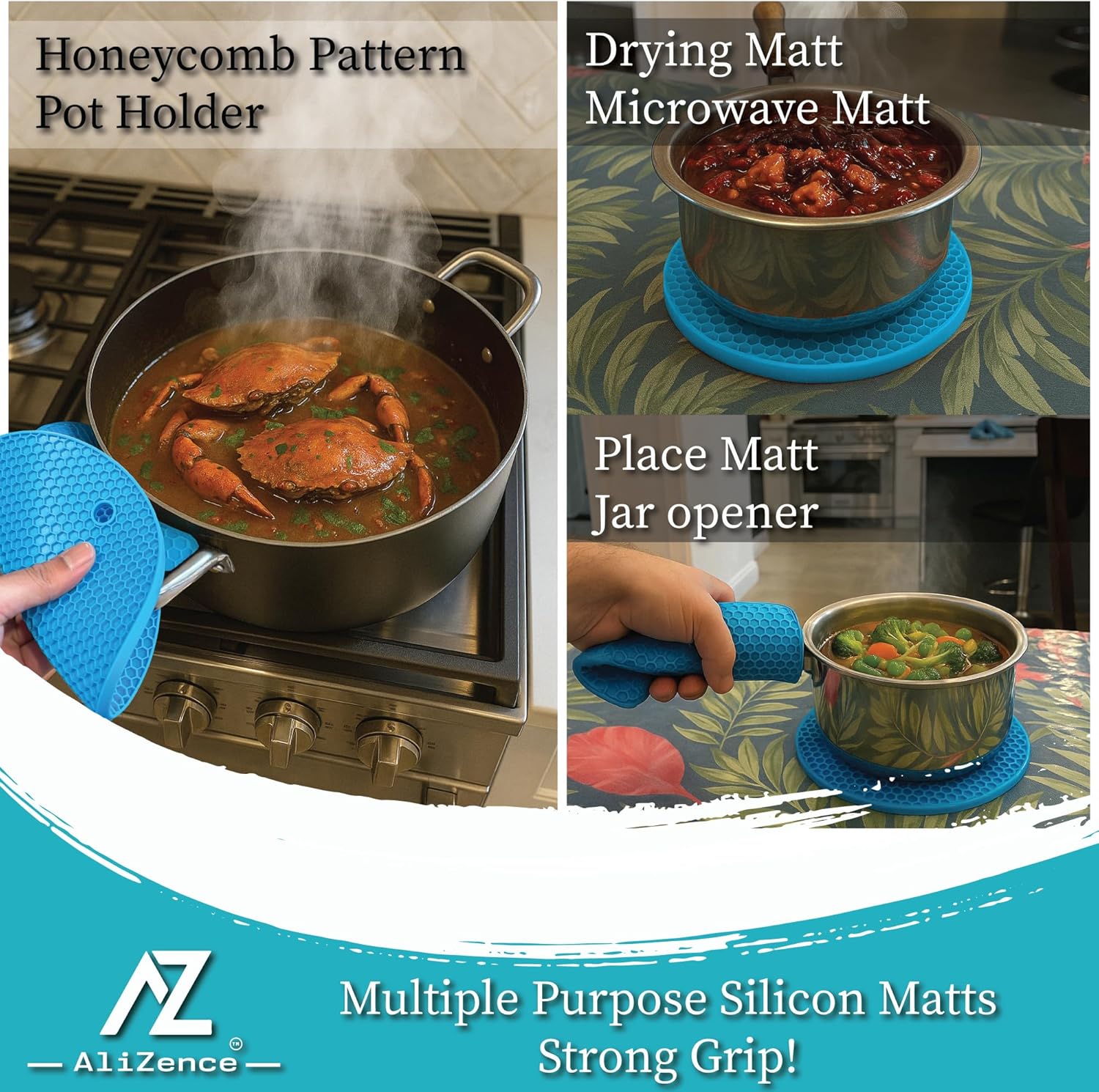 - Complete 6-Piece Kitchen Set: The AliZence Kitchen Essentials Set Includes two long silicone gloves (13 inches), two silicone pinch gloves, and two round hot trivet mats, designed for handling hot cookware safely.