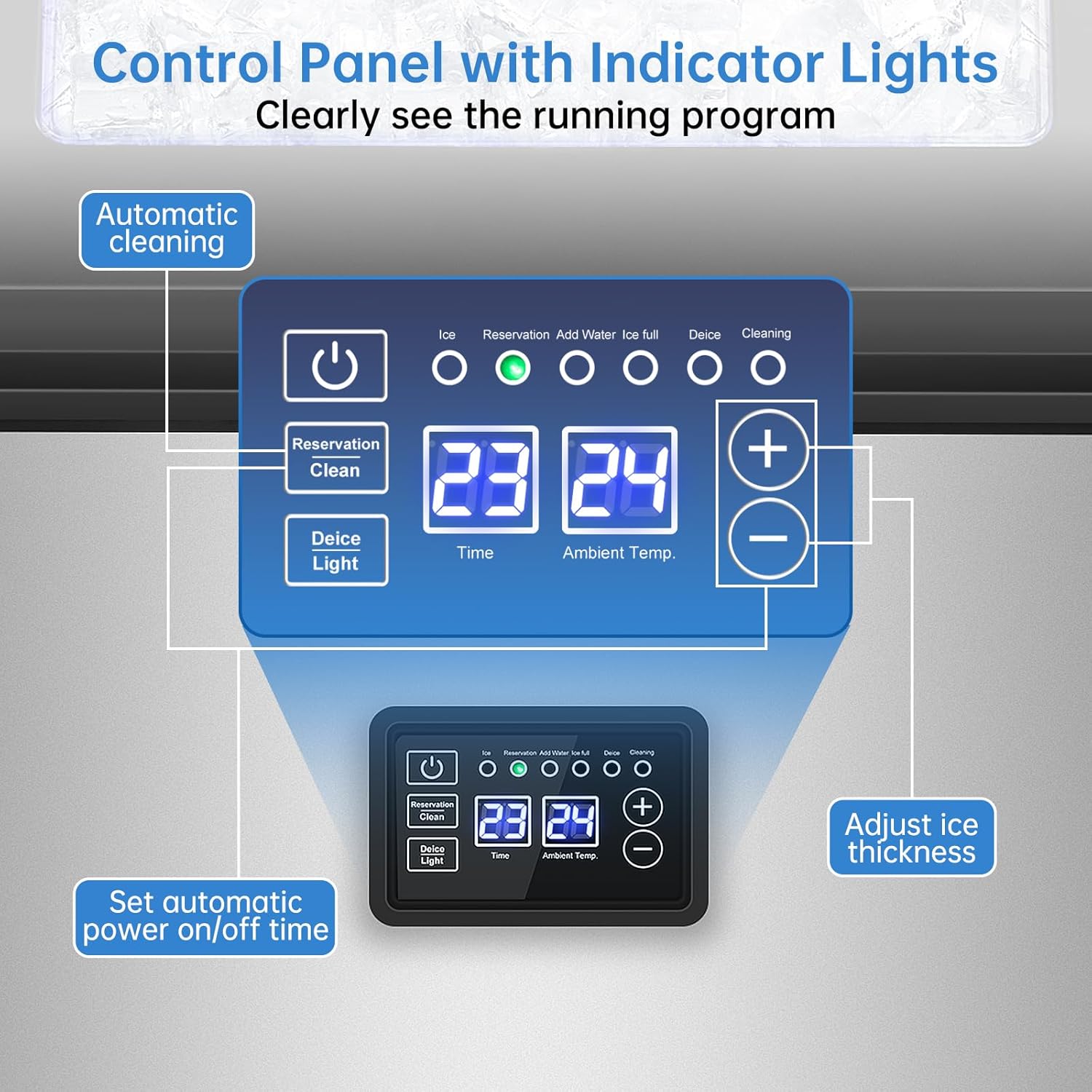 - Smart Features for Easy Maintenance: Save time with auto-cleaning and programmable timer functions, ensuring hygienic ice production with minimal effort. Adjust ice thickness to suit different drinks and preferences—perfect for cocktails, iced coffee, and more!