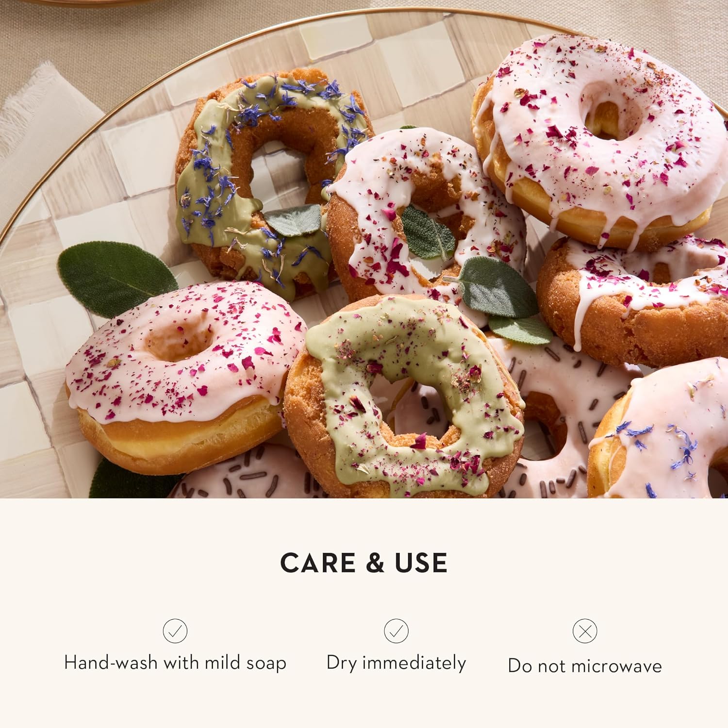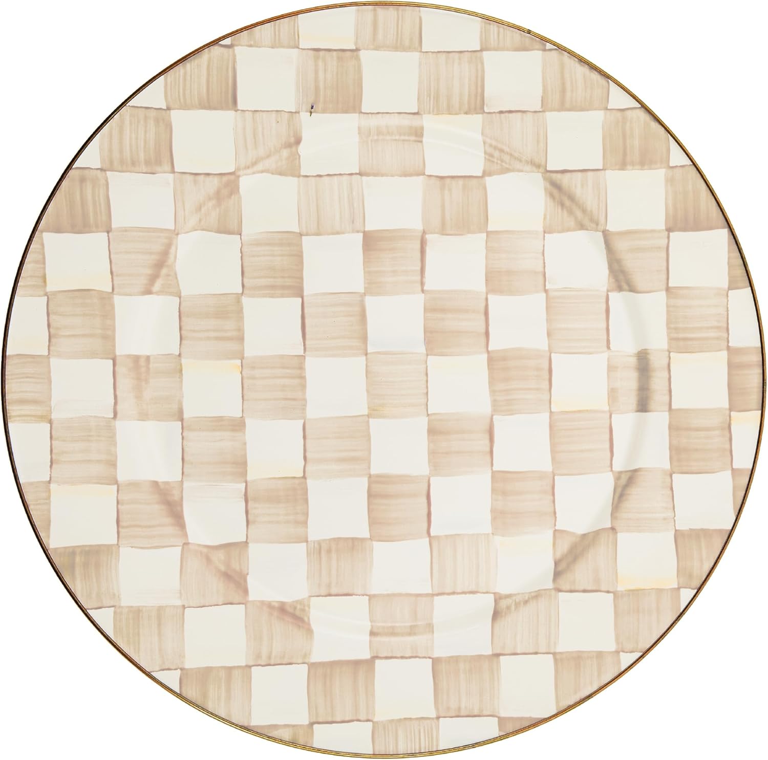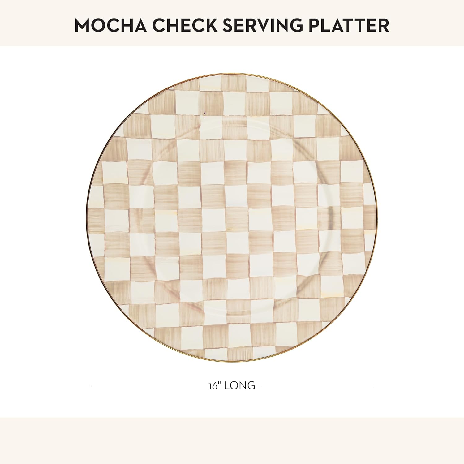 - ENTERTAINING ESSENTIAL: Serving dishes for entertaining don’t get any more charming than this. Our Mocha Check food platter features a hand-painted brown-and-white checkered pattern, a heavy-gauge steel underbody, and a bronzed stainless-steel rim.
