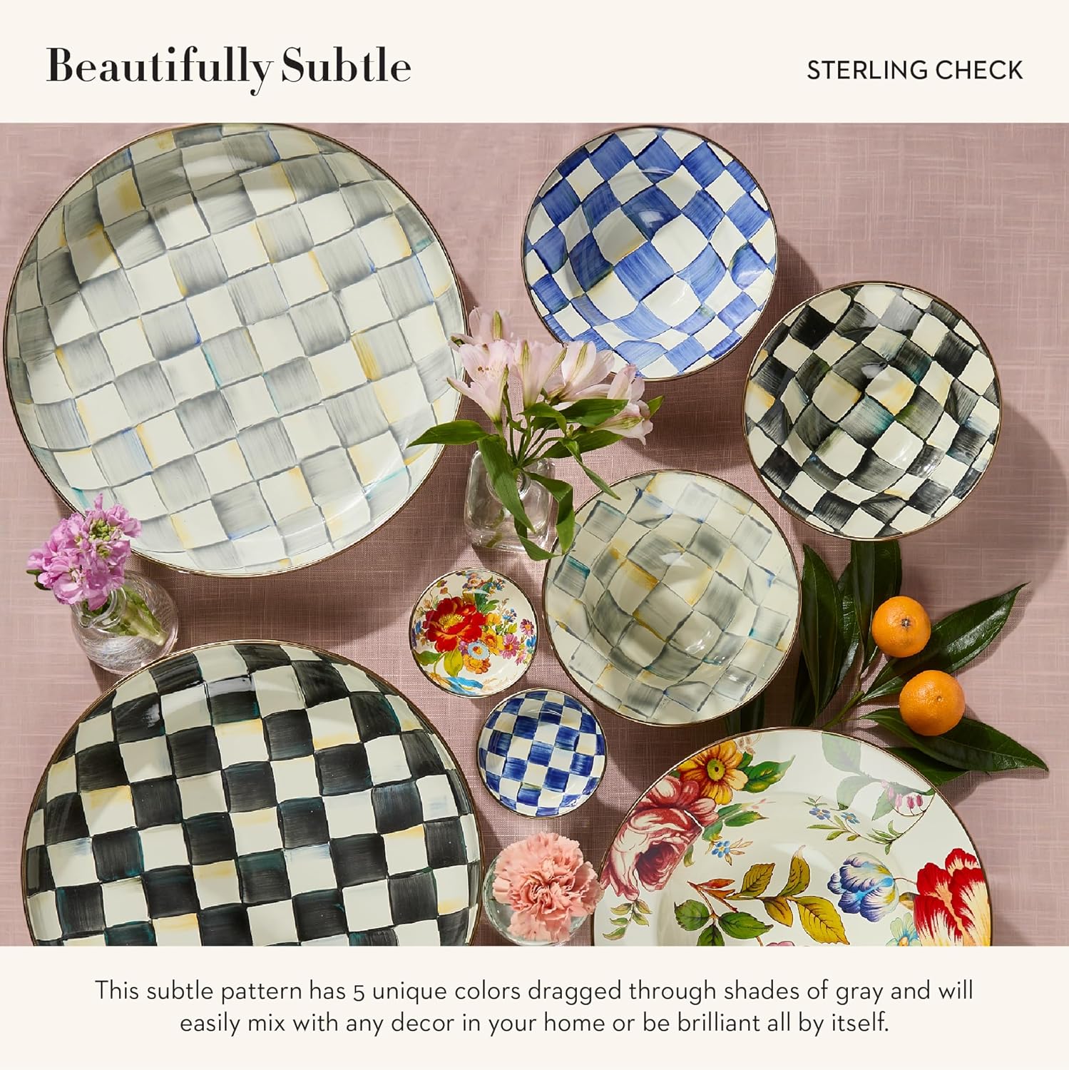 - ELEGANT SERVING ESSENTIAL: The Sterling Check decorative salad bowl features a subtle gray-and-white pattern hand painted on a hand-glazed heavy-gauge steel underbody rimmed in bronzed stainless steel. It’s accompanied by acacia-wood salad servers.