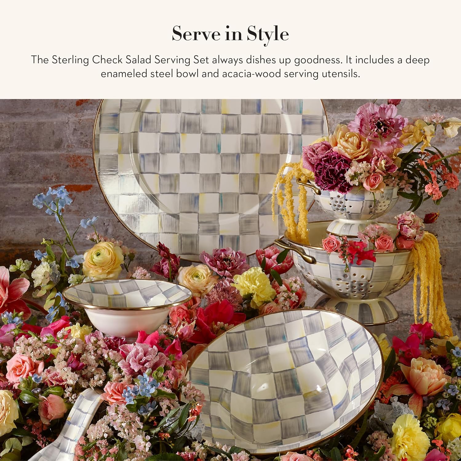 MACKENZIE-CHILDS Enamel Salad Serving Set, Enamel Bowl and Wooden Salad Servers, Decorative Kitchen Set, Gray-and-White Sterling Check