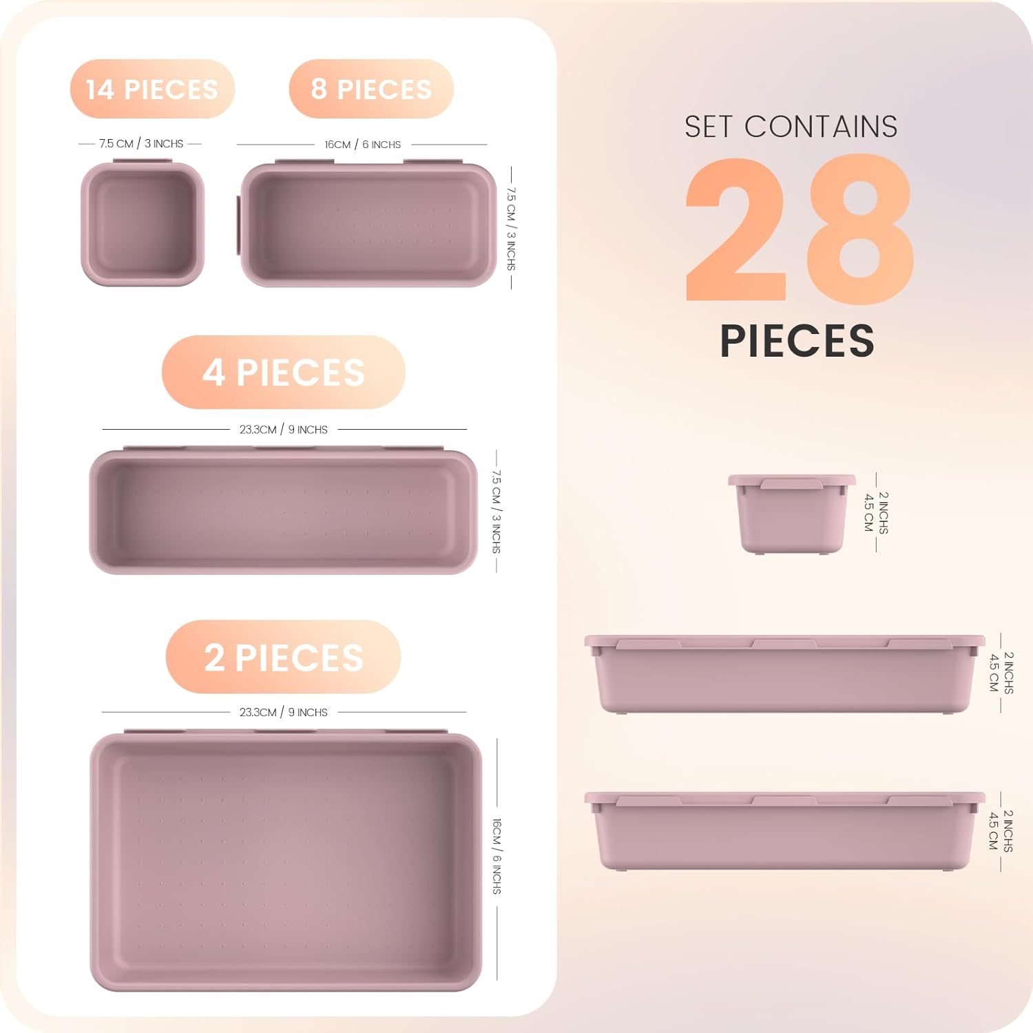 - 【28Pcs & 4 Sizes】 ---- One set includes Purple 28pcs storage bins in 4 different sizes, which help you customize combinations to store items and organize drawer in shelves/closets/cabinets/dressers. Includes: 9 inch*6 inch*2 inch, 8 Long sizes:6 inch*3 inch*2 inch, 4 Medium sizes:9 inch*3 inch*2 inch, 14 Small sizes:3 inch*3 inch*2 inch.