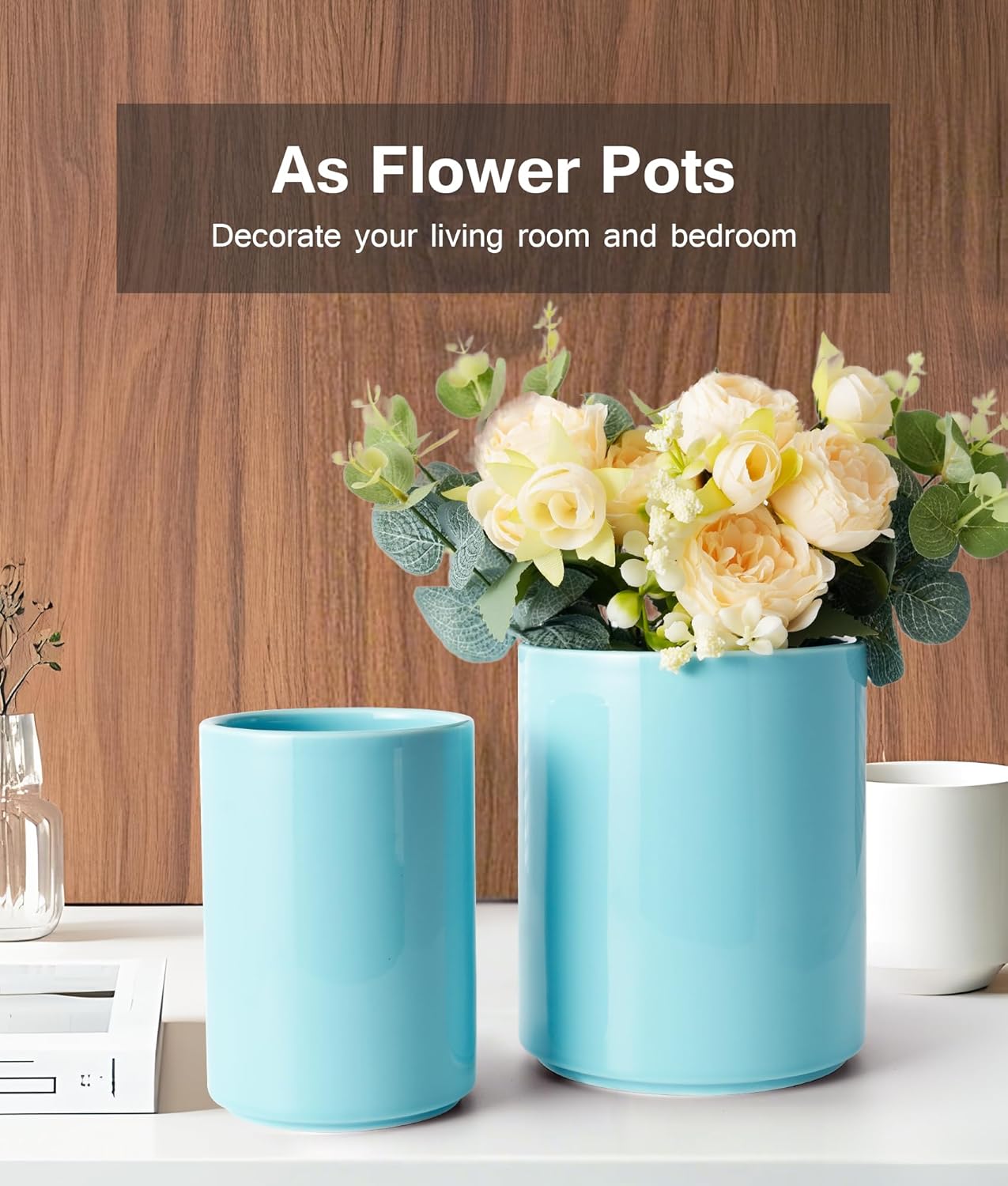Set of 2 Utensil Holder, 7"+5" Ceramic Kitchen Utensil Holder for Countertop, Large Cooking Utensil Crocks for Counter, Morden Utensil Organizer for Spatula, Kitchen Decor (Blue)