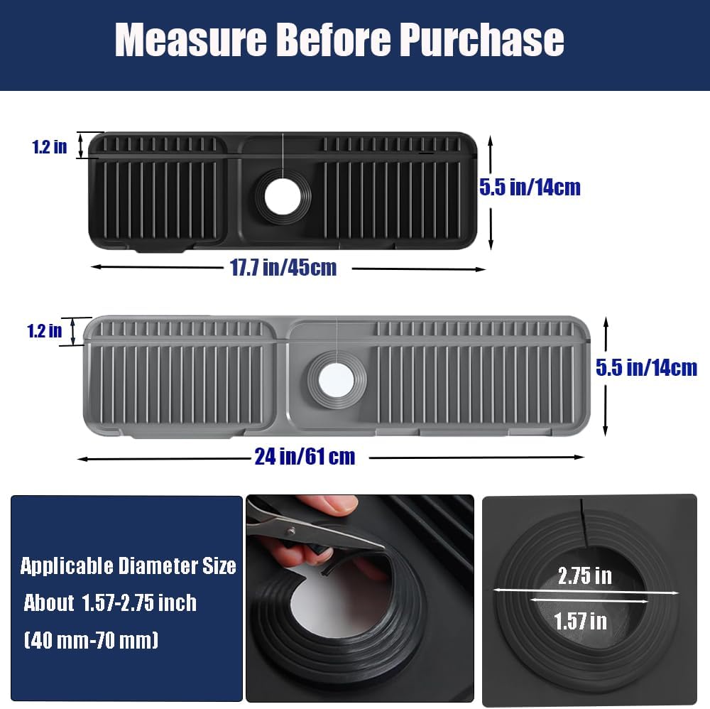 - Measure Before Purchasing:To ensure a perfect fit, please measure your faucet and sink dimensions before purchasing. The size of kitchen faucet splash guard is 17.7" x 5.5",The diameter range of the cutting hole for the faucet splash guard pad is 1.57 "-2.75".Suitable for most sinks(Attention:Not applicable to curved edge, built-in filters or hand soap dispensers)