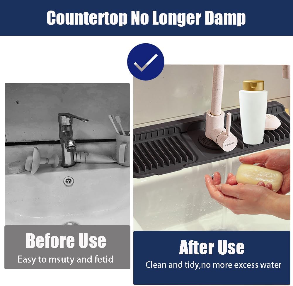 - Silicone Material & Easy to Clean:Our kitchen faucet mat is made from food-grade silicone,soft,durable and reusable.It has a non-slip surface and reinforced backing, providing stability and support for heavier items.Easy to clean: you can wash it by hand or put it in the dishwasher