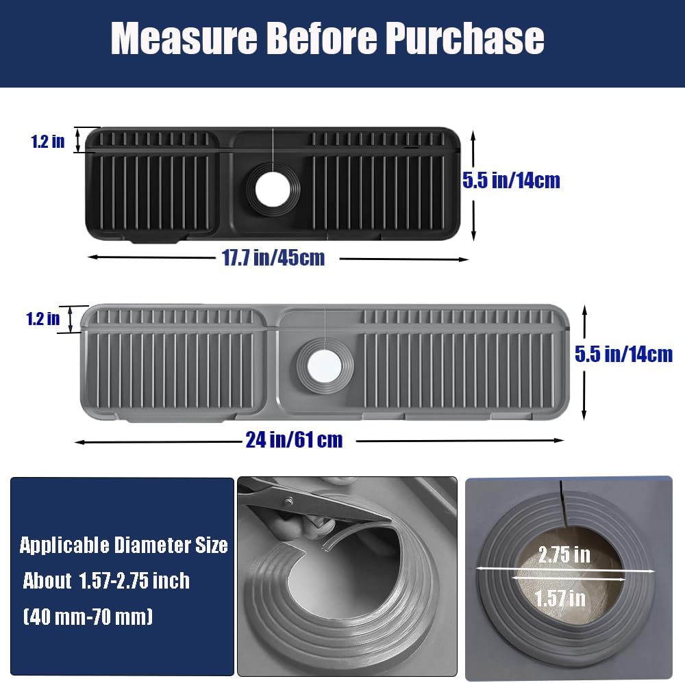 - Measure Before Purchasing:To ensure a perfect fit, please measure your faucet and sink dimensions before purchasing. The size of kitchen faucet splash guard is 24" x 5.5" ,The diameter range of the cutting hole for the faucet splash guard pad is 1.57 "-2.75".Suitable for most sinks(Attention:Not applicable to curved edge, built-in filters or hand soap dispensers)