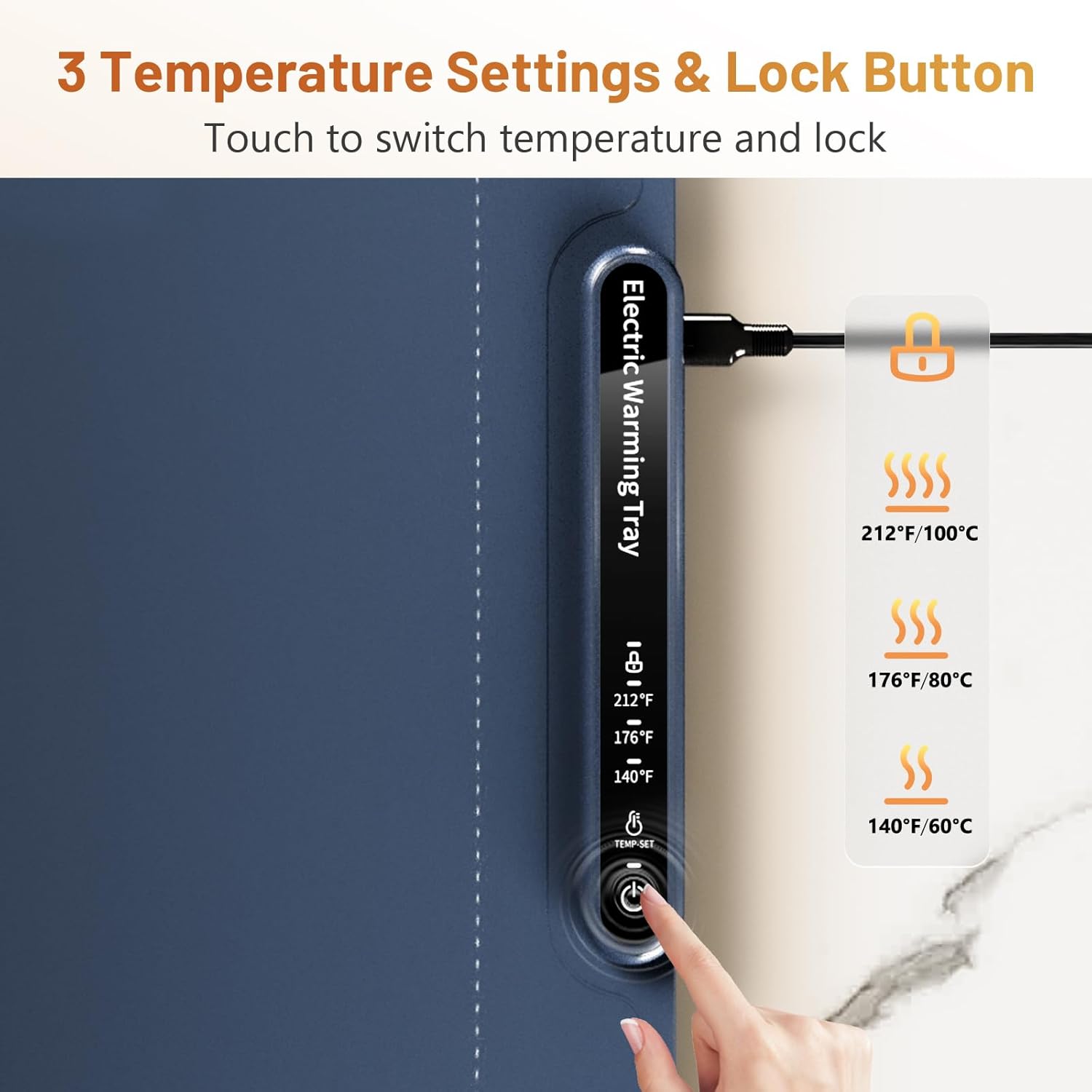 - 3 Temperature Settings & Child Lock: This food warmer offers three adjustable temperature settings (60℃, 80℃, and 100℃) to cater to different dining preferences. The heating mat features an automatic shut-off function after 3 hours to save energy. The built-in child lock ensures safe usage, preventing accidental adjustments by children.