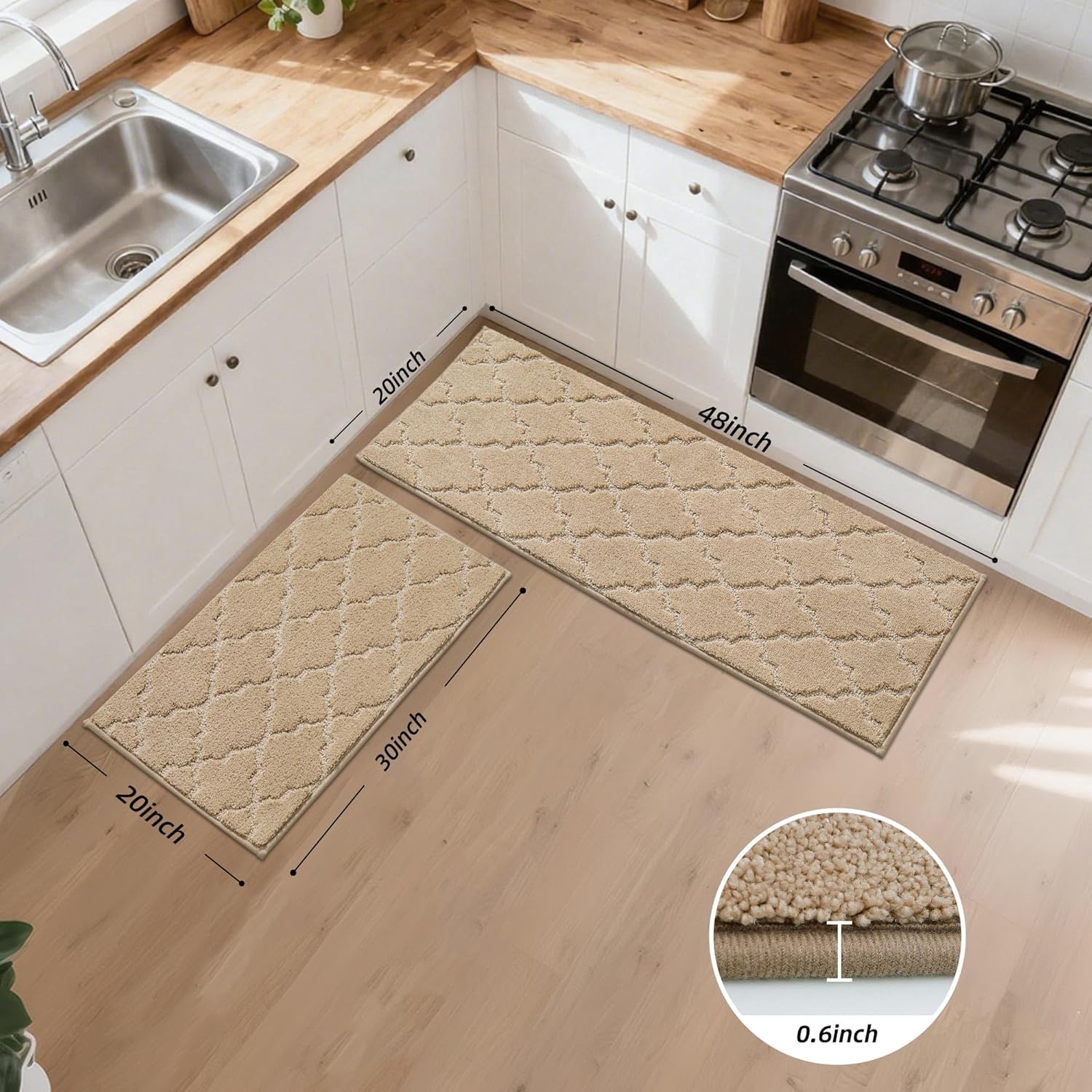 JSEI Kitchen Rugs, Non-Slip Kitchen Mats for Floor, Soft Washable Absorbent Kitchen Mats 2 Pieces, Kitchen Carpet Runner with TPR Backing, Polyester, 20”x32”+20”x48”, Beige