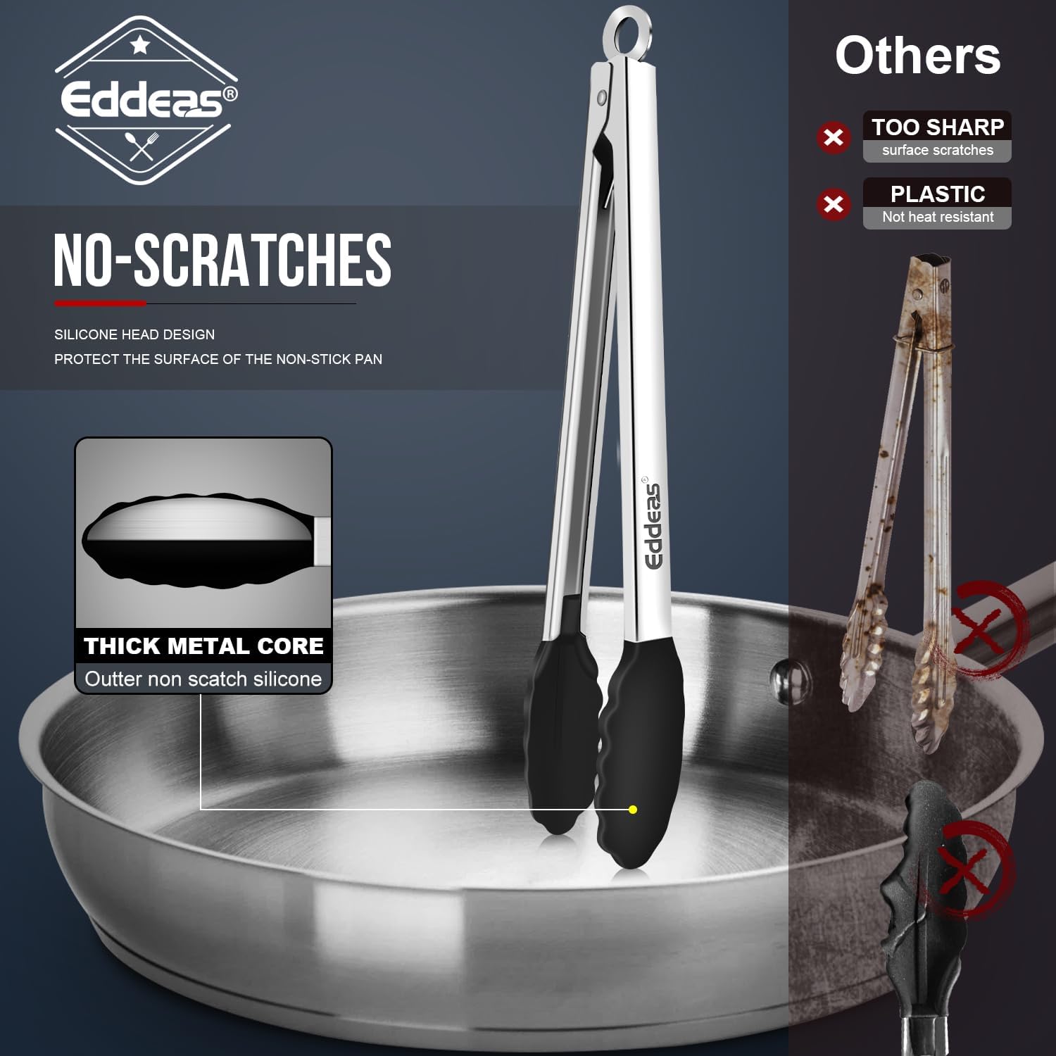 - FOOD GRADE STAINLESS STEEL & SILICONE - Eddeas tongs for cooking featuring a food grade silicone head, the tongs are gentle on your nonstick cookware so you can worry less about scratching and wear and tear, silicone is heat resistant up to 600 degrees Fahrenheit, making it a great option for nearly any cooking task.