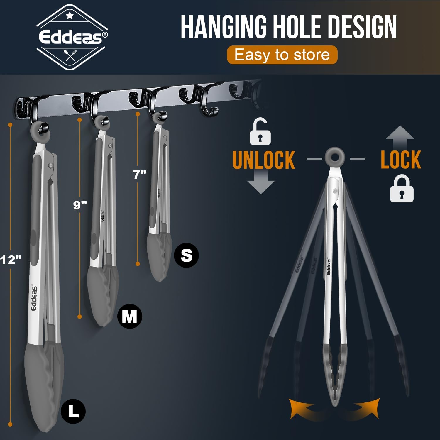 - LOCKING MECHANISM & PULL-RING TECHNOLOGY - Eddeas ring-pull technology will keep your tongs from opening and closing accidentally which will allow you to facilitate better control while using them. And can be conveniently dried and stored. the tongs easily become compact when you pull the easy pull lock up, they fit seamlessly in most drawers and cabinets for easy storage; also include a hook for easy hang