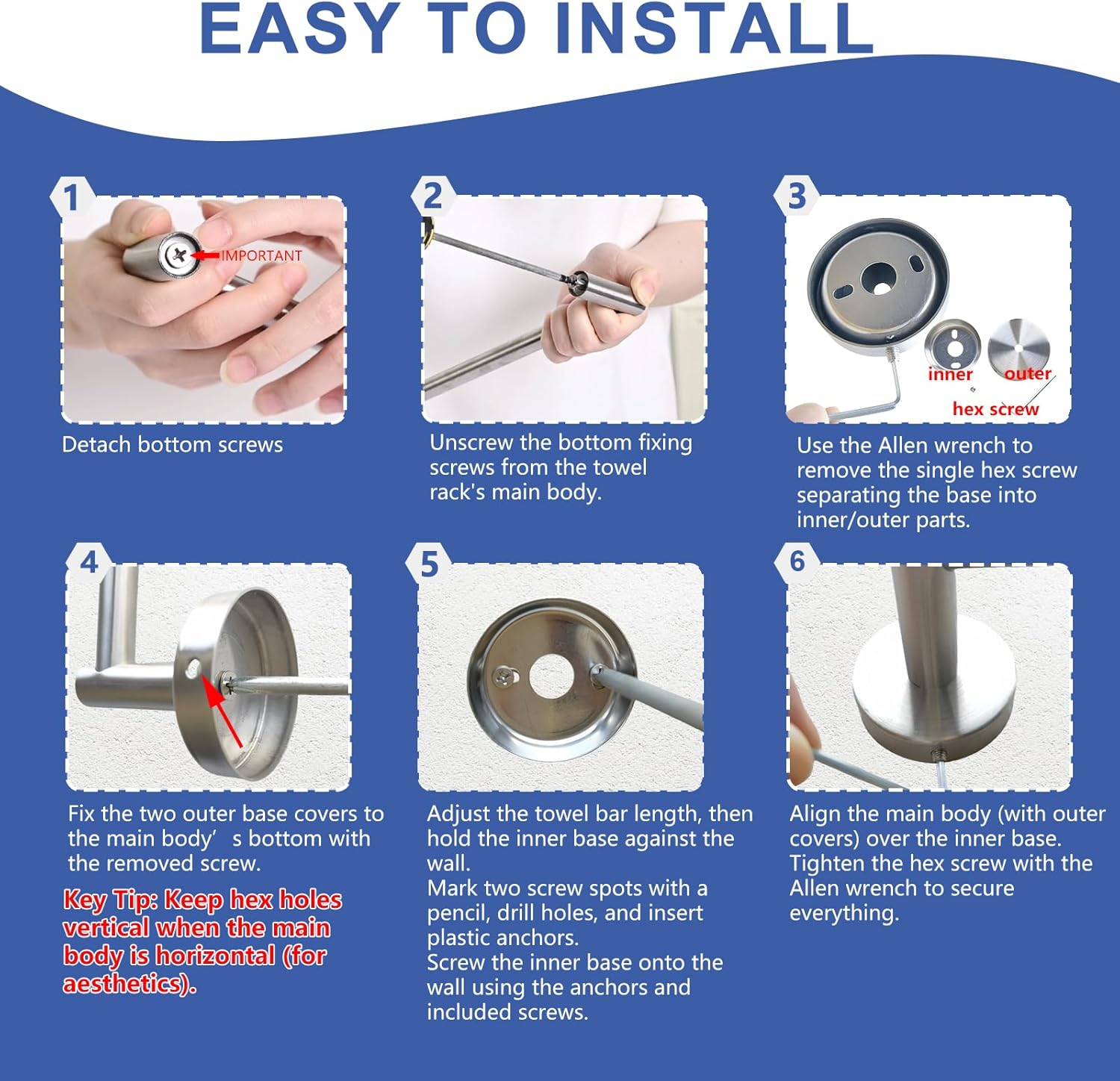 - Adjustable Size: Our Stainless Steel Towel Bar allows for easy length adjustment, with the outer diameter ranging from 13 to 23 inches and the effective towel-hanging length spanning 12 to 22 inches. This versatile design makes it suitable for various space sizes, perfectly fitting any bathroom—whether compact or spacious—while optimizing towel-hanging capacity.