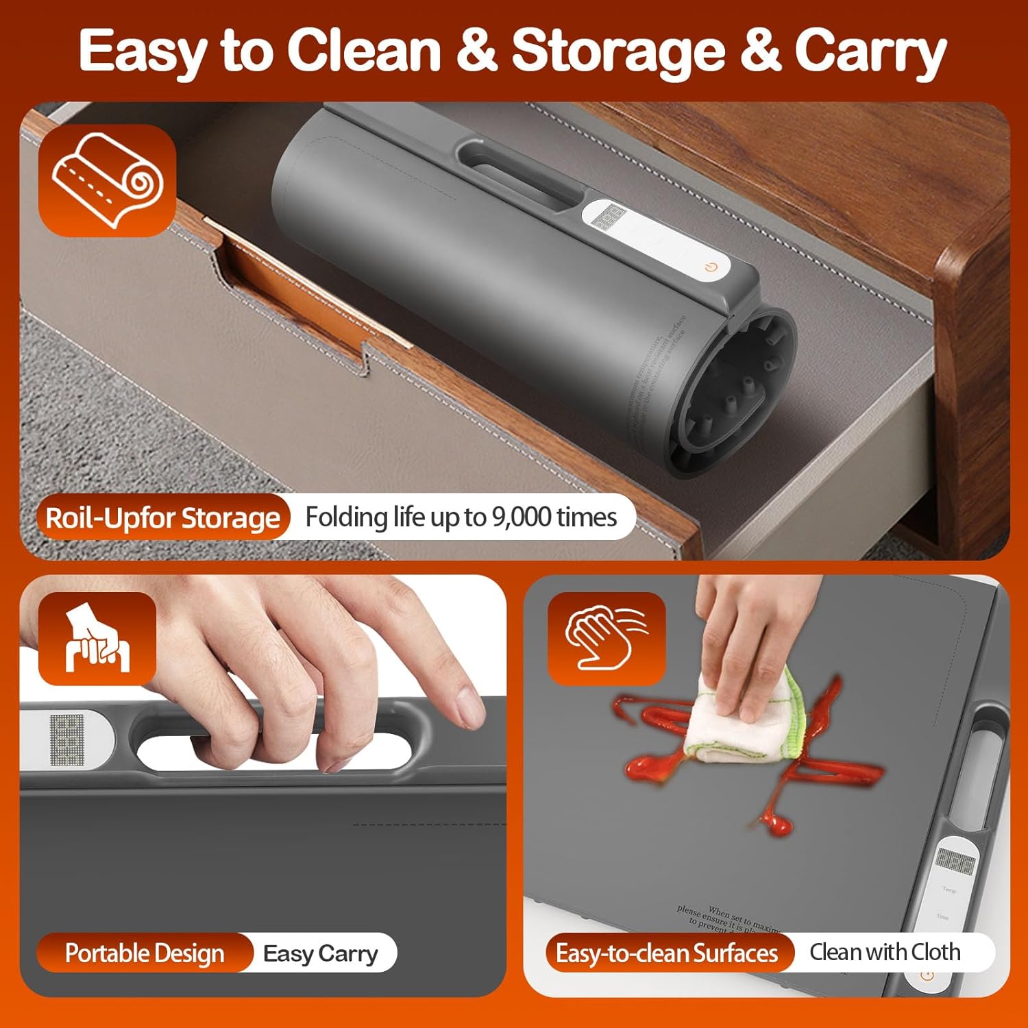 - [Adjustable 8-Level temperature control] Silicone electric warming mat for food features 8 adjustable temperature settings (86℉-212℉), perfect for defrosting, heating, and keeping meals warm. Designed as a countertop food warming mat with temp control, it supports sourdough starters, bread proofing, and seed germination. The NTC temperature module ensures precise heat distribution for both small and extra-large buffet setups.