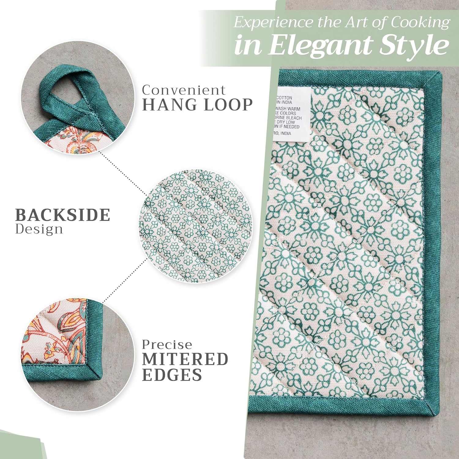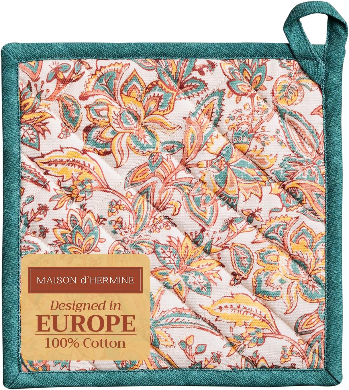 - Package includes: 1 pot holder measures 8"x8". Ideal as a hot pad for dishes, coffee pots, cast iron pans, or cookware. Designed in Europe and Made in India, it blends style, function, and comfort into a daily kitchen essential