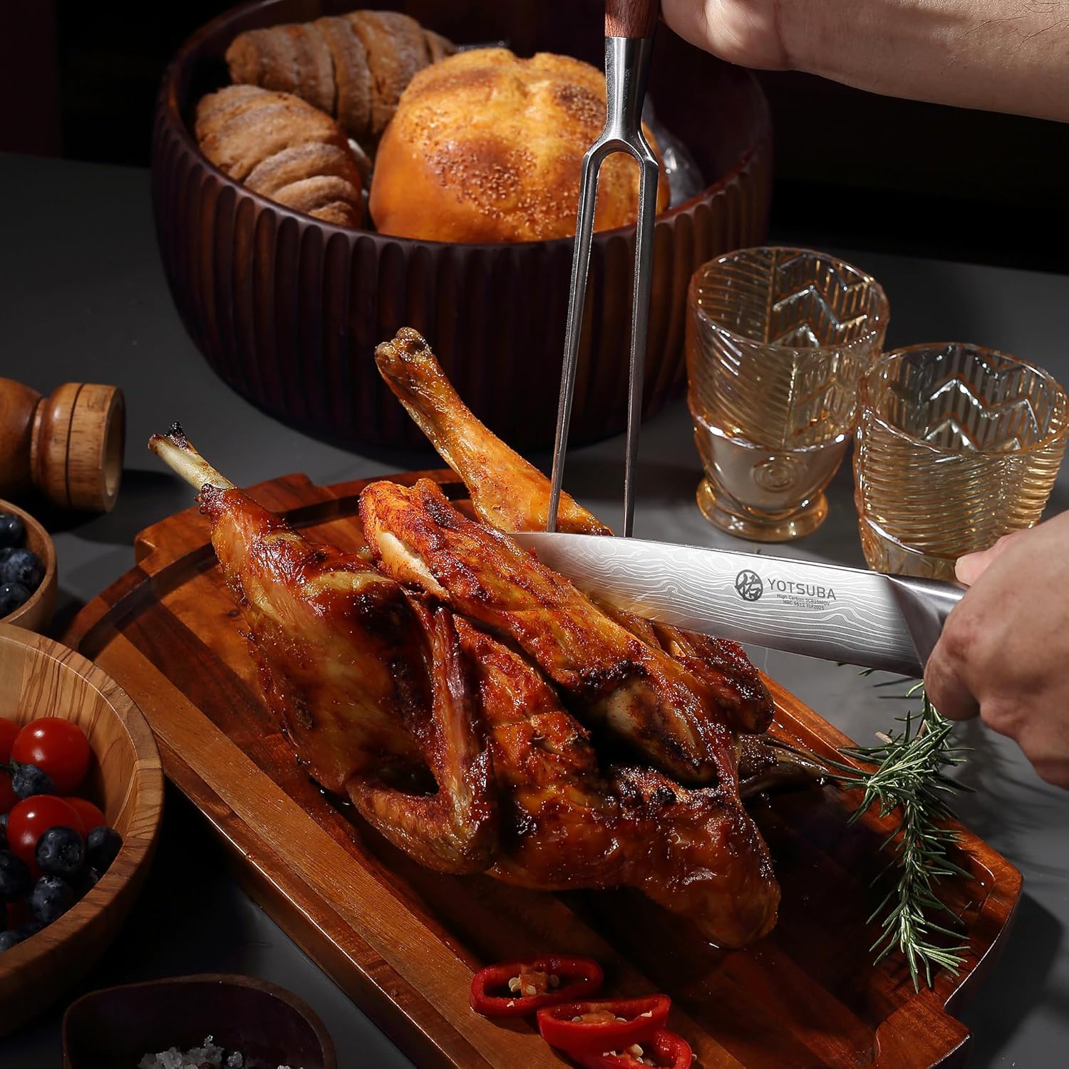 - RAZOR-SHARP BLADES: YOTSUBA carving knives and fork set with carefully sharpening by our professional craftsmen, the blade edge reached 14-16 degrees per side, a subtle tilt that not only improves cutting efficiency and reduces resistance when cutting, but also ensures the stability and durability of the blade. The bbq meat cutting Knife minimizes ingredient waste while ensuring cutting precision