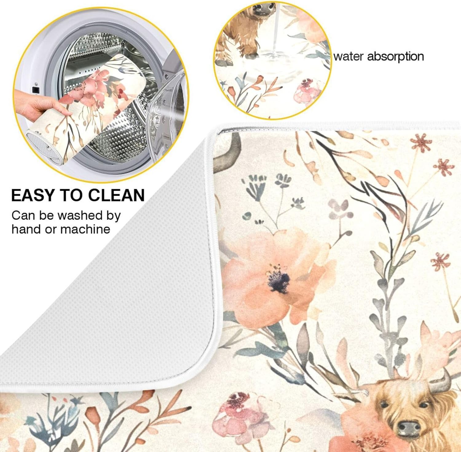 Cute Highland Cows Flowers Dish Drying Mat for Kitchen Counter Absorbent Microfiber Drying Pad, Medium 16x18 in, Reversible Drainer Mats