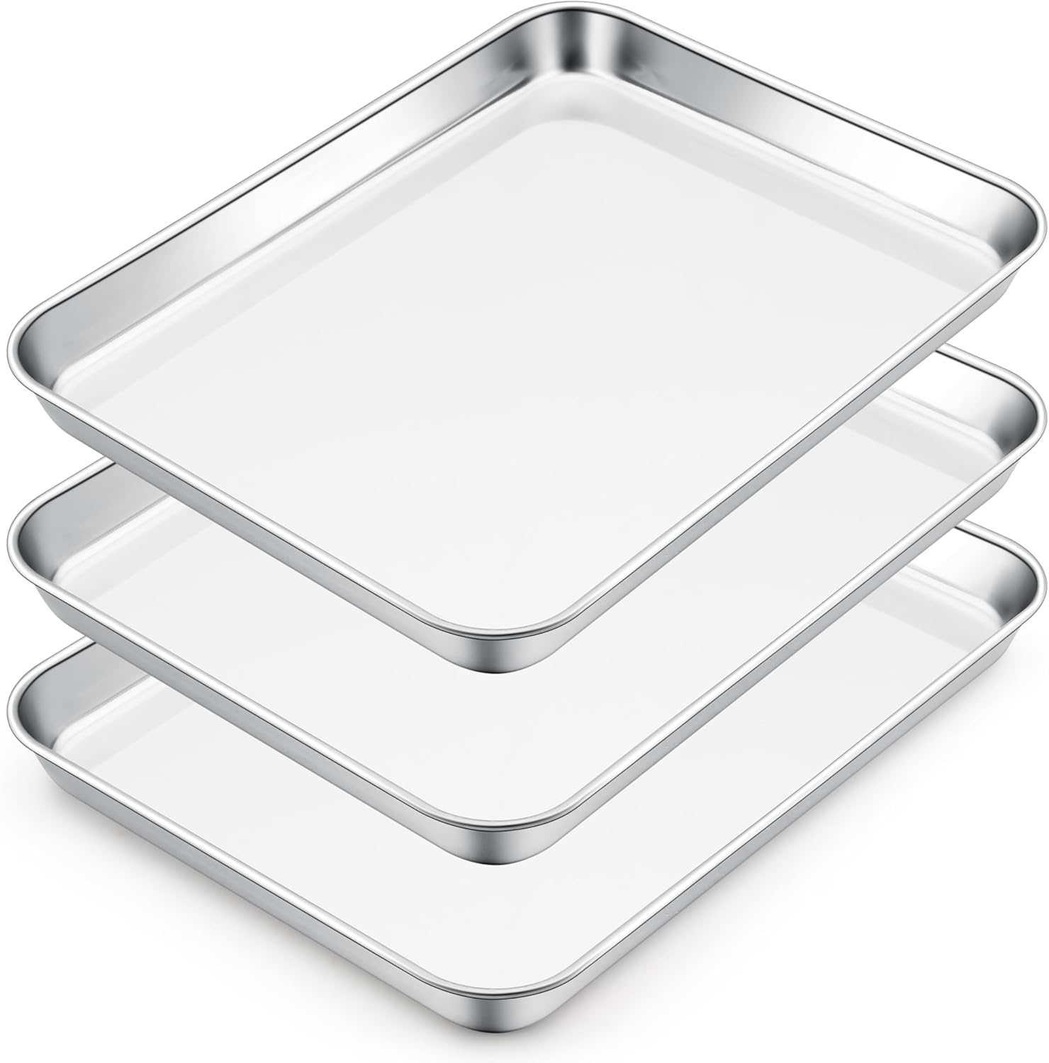 E-far Small Baking Sheet Set of 3, 10.5”x8.3” Stainless Steel Cookie Sheets Pans, Compact Non-toxic Metal Toaster Oven Trays for Cake, Healthy & Rust Free, Mirror Finish & Dishwasher Safe