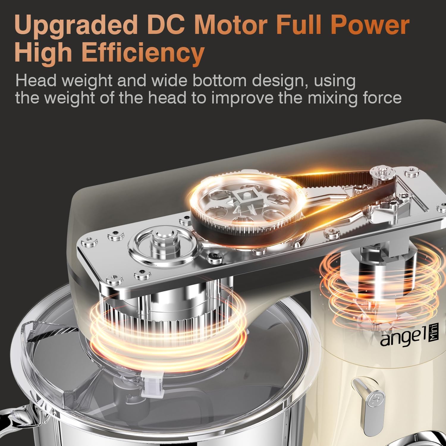 - 【Upgrated DC Motor System 】Mini Angel stand mixers adopt all metal gear structure, with closed gearbox, effectively reduce the sound, speed running stable without stalling with can long service life. And the planetary mixing system which functions more touch points per rotation during mixing process, so that all the mix is stirred at a full extent.