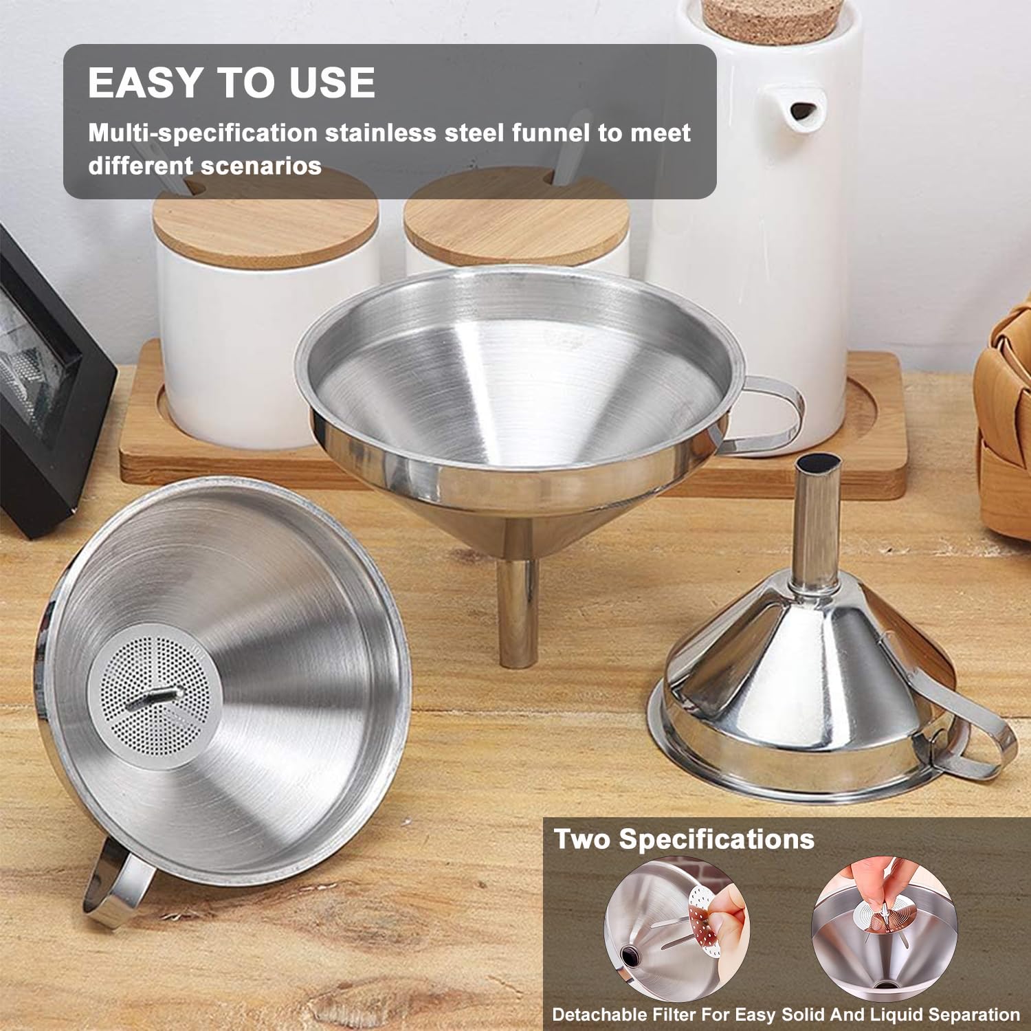 - [5-Size Multi-Task Kit] Cooking funnels set of 3,Large (5.1"/12.95cm);Medium (4.3 "/10.9 cm),(3''/7.6cm );Small (2"/5.08cm)&(1.8"/4.6cm)for your different needs. Two removable strainer is included helping prevent clogging of the stem