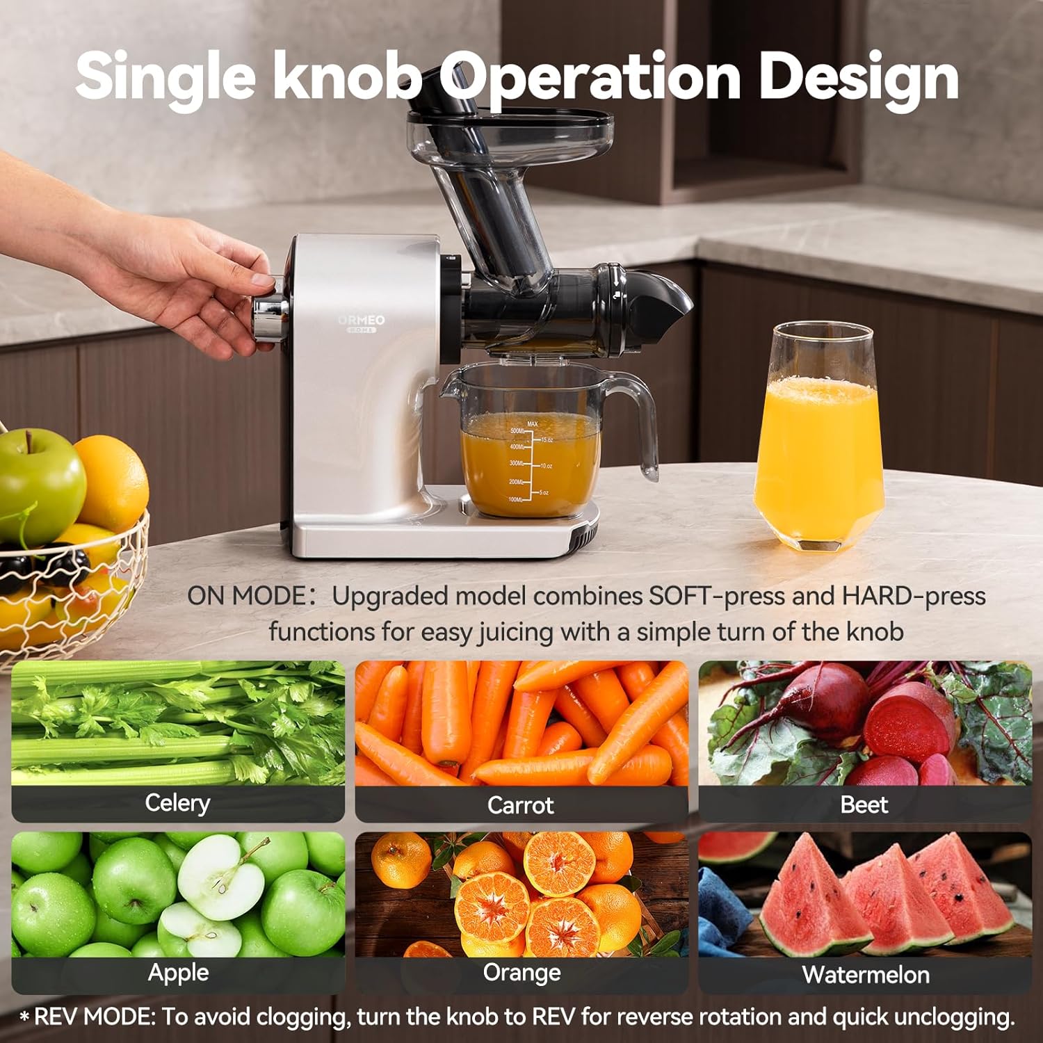 - 【Single Knob Control】 Our upgraded slow masticating juicer combines soft and hard pressing modes. Simply add fruits or vegetables, turn the knob to "ON" to start juicing, and help prevent clogging. The juicer also includes a reversing function, making juicing effortless.