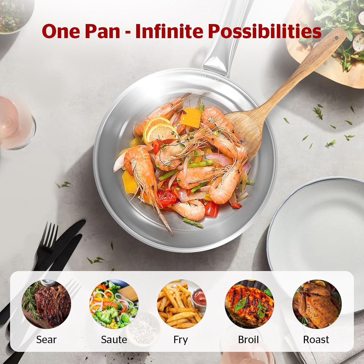 - Stay-Cool Ergonomic Handle – Designed for comfort and safety, the stainless steel handle will stay cool while you cook and offers a secure, strain-free grip — even at high temperatures.