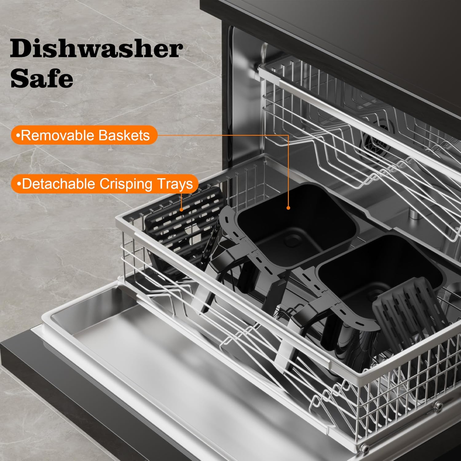 - 【NON-STICK & DISHWASHER SAFE】: The non-stick coating on the baskets ensures food doesn’t stick, making cleanup a breeze. Both baskets and trays are dishwasher safe, saving you time and effort after cooking