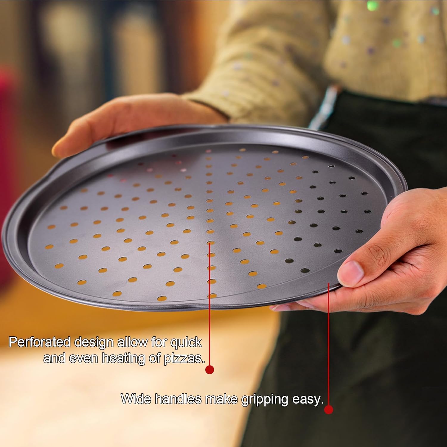 - 【Considerate Design】 Compared to other pizza pans, this round pizza pan has been improved with wider handles, making it easier to hold the pizza pan. In addition, the pizza pan is perforated to promote air circulation, making the baked pizza crust crisper and easy to release