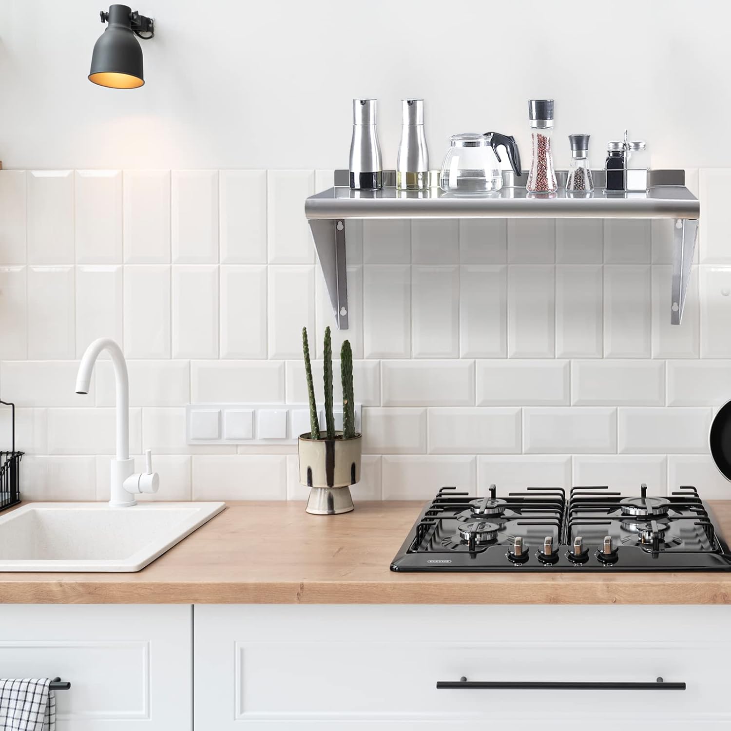 - 3 EXTRA SUPPORT BRACKETS: Our commercial shelves is Engineered with 3 extra support brackets, this wall-mounted stainless steel shelf delivers unshakable stability for heavy kitchen appliances like microwaves, rice cookers, or bulk pantry items