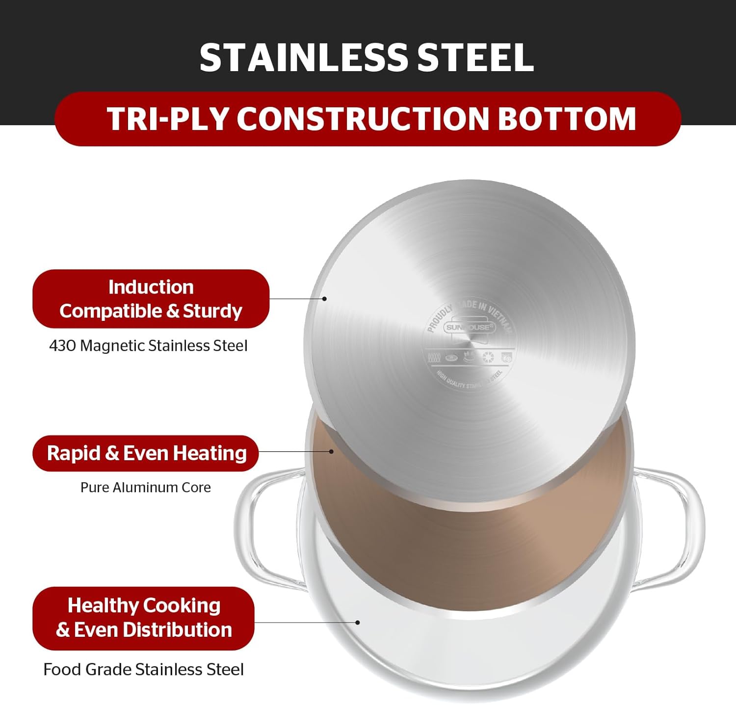 - [Sleek & Clean Design] - Enjoy a polished, modern aesthetic combined with the health benefits of food-grade stainless steel. Cook with confidence and pride using premium cookware from SUNHOUSE.