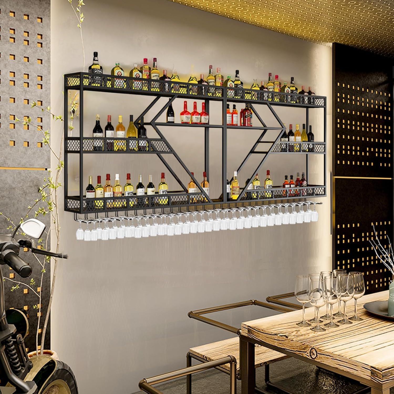 - 【SIMPLE AND GENEROUS】Suspended wine rack can effectively store wine bottles with outstanding style and design. Easy to clean and convenient to take care of. Make your wine bottles and glassware are neatly organized and easily accessible, adding a touch of sophistication to your space