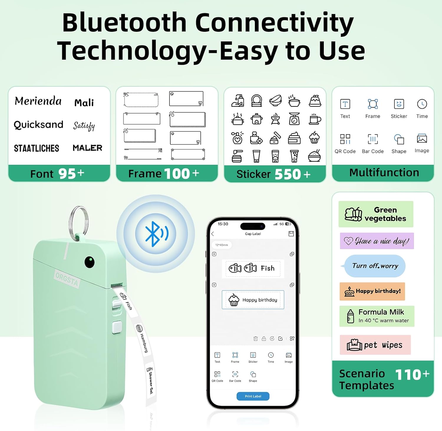 ORGSTA S001 Label Maker Machine with Tape, Portable Bluetooth Label Maker for Home and Office Organization, Thermal Label Printer Mini Label Maker with Multiple Templates, Green