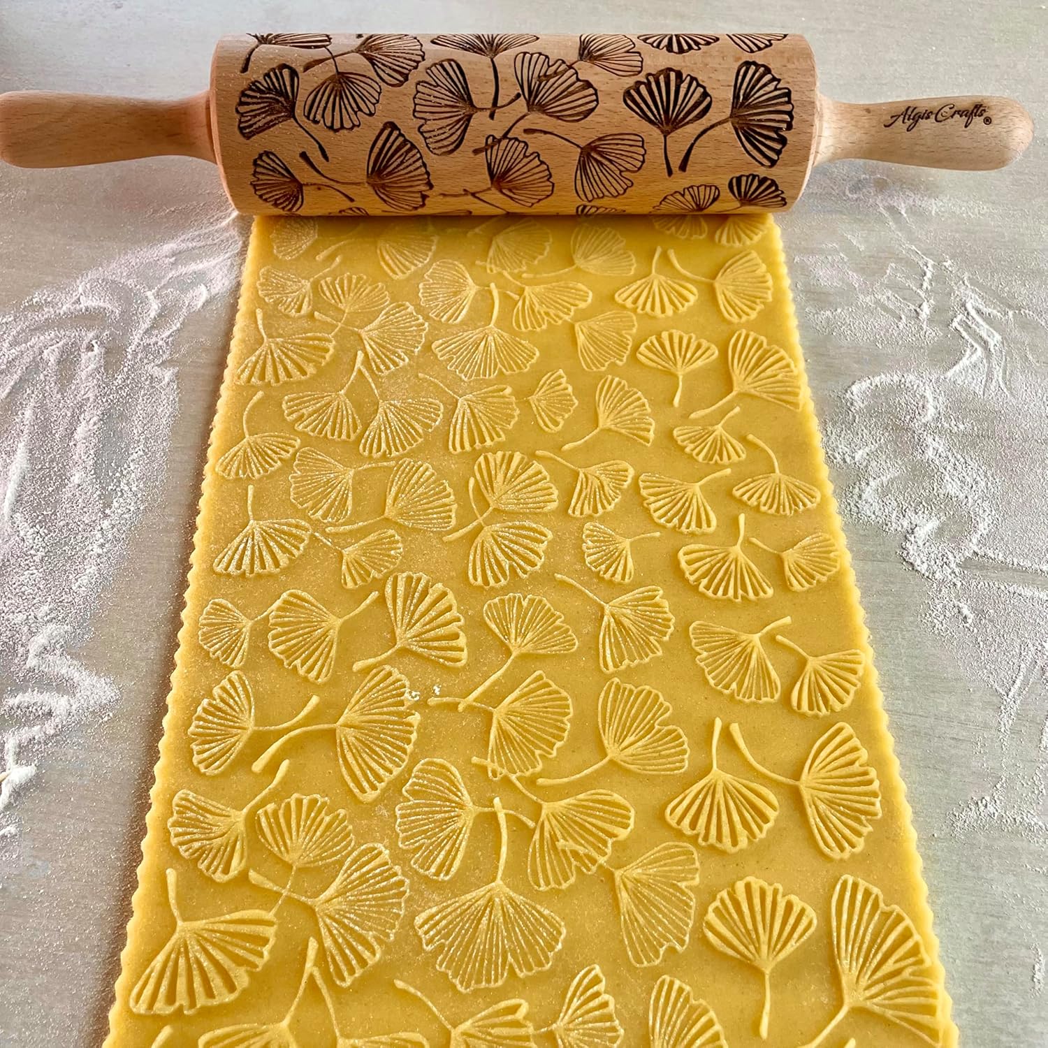 Embossing Rolling Pin GINKGO with Ginkgo Biloba Leaves Pattern – Dough and Clay Roller for Embossed Cookies and Pottery - Cookie and Ceramic Stamp - Baking Gifts for Women by Algis Crafts