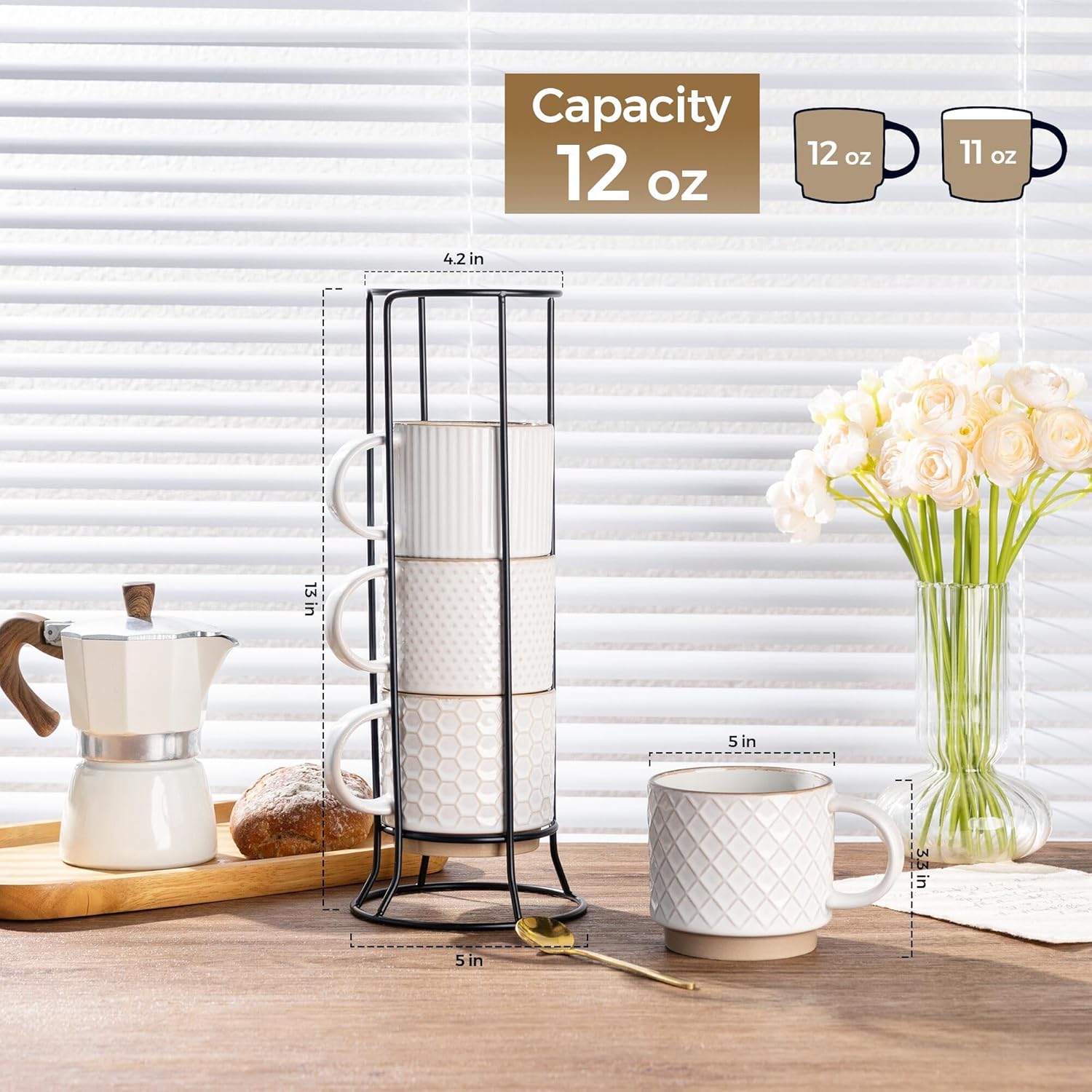 GBHOME 12OZ Stackable Coffee Mugs with Stand, Ceramic Coffee Mugs with Texture Patterns for Man,Woman,Dad,Mom, Modern Coffee Cups Set of 4 for Latte/Cappuccino/Cocoa. Dishwasher&Microwave Safe