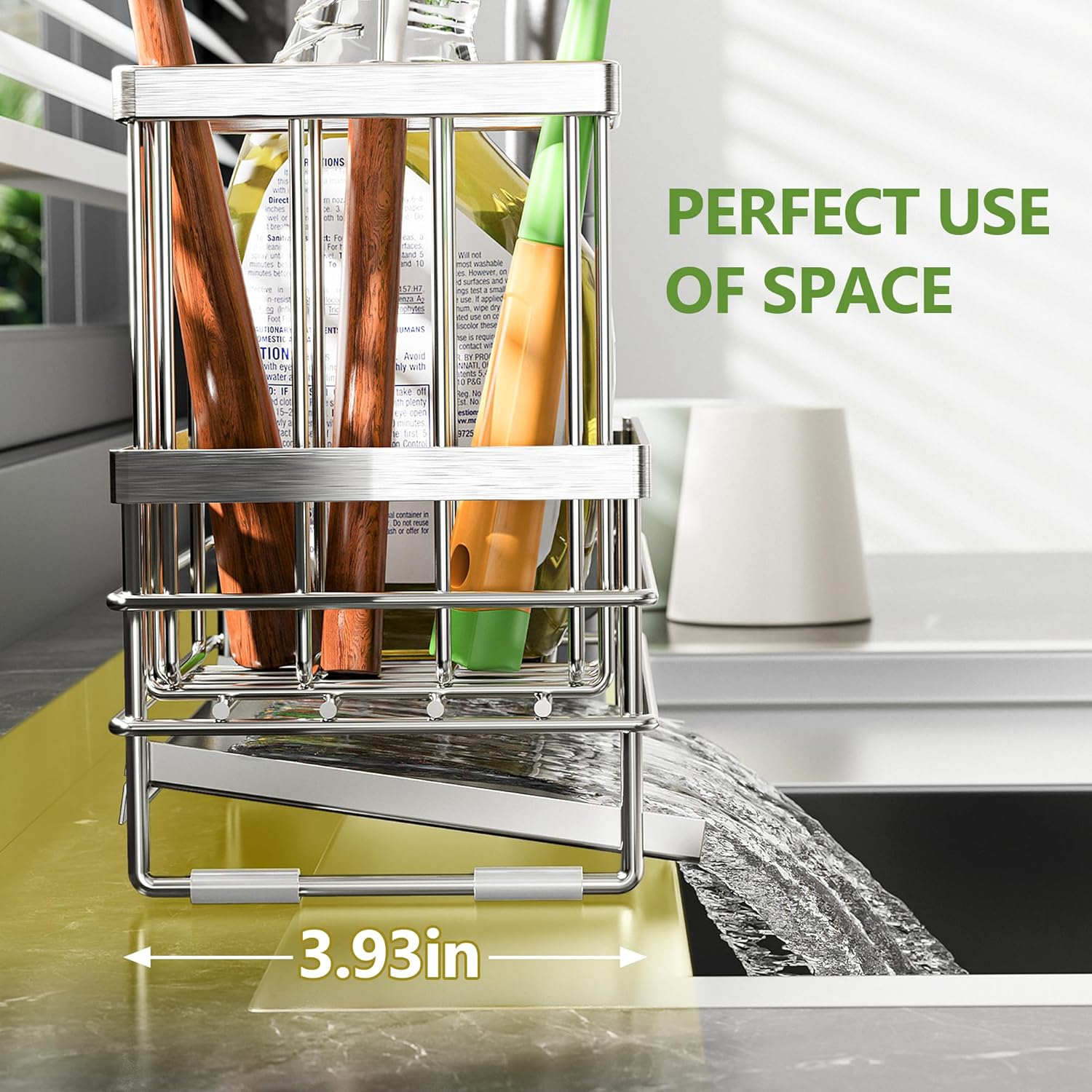 - MULTIPLE USE: With a compact structure, Cisily sink caddy is ideal for various item storage, allowing you to organize sponges, dish soap, spice bottles, cutlery, etc. This stainless caddy is also perfect for other humid areas, such as the bathroom, where it can store toothbrushes, combs, shampoo, and other toiletries.