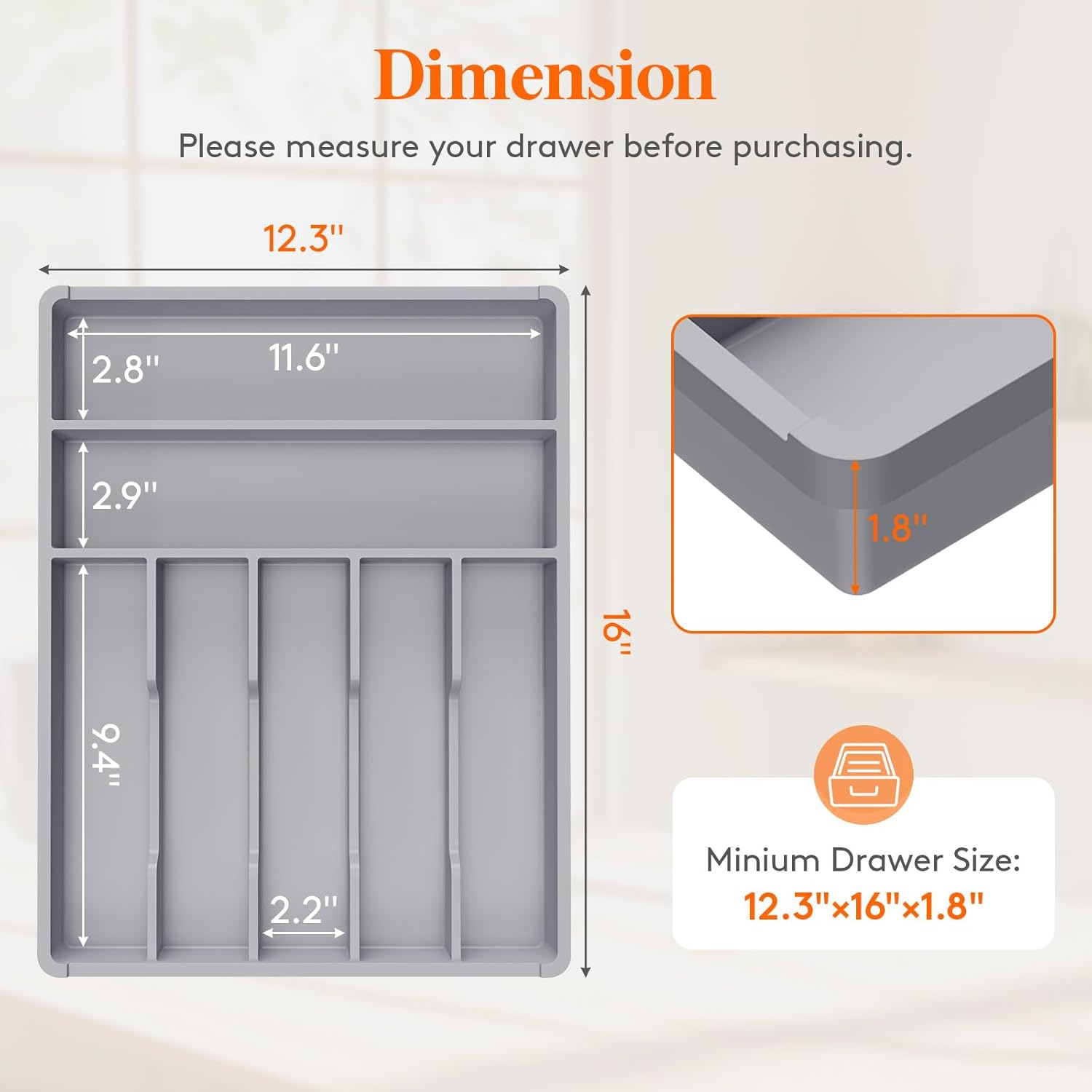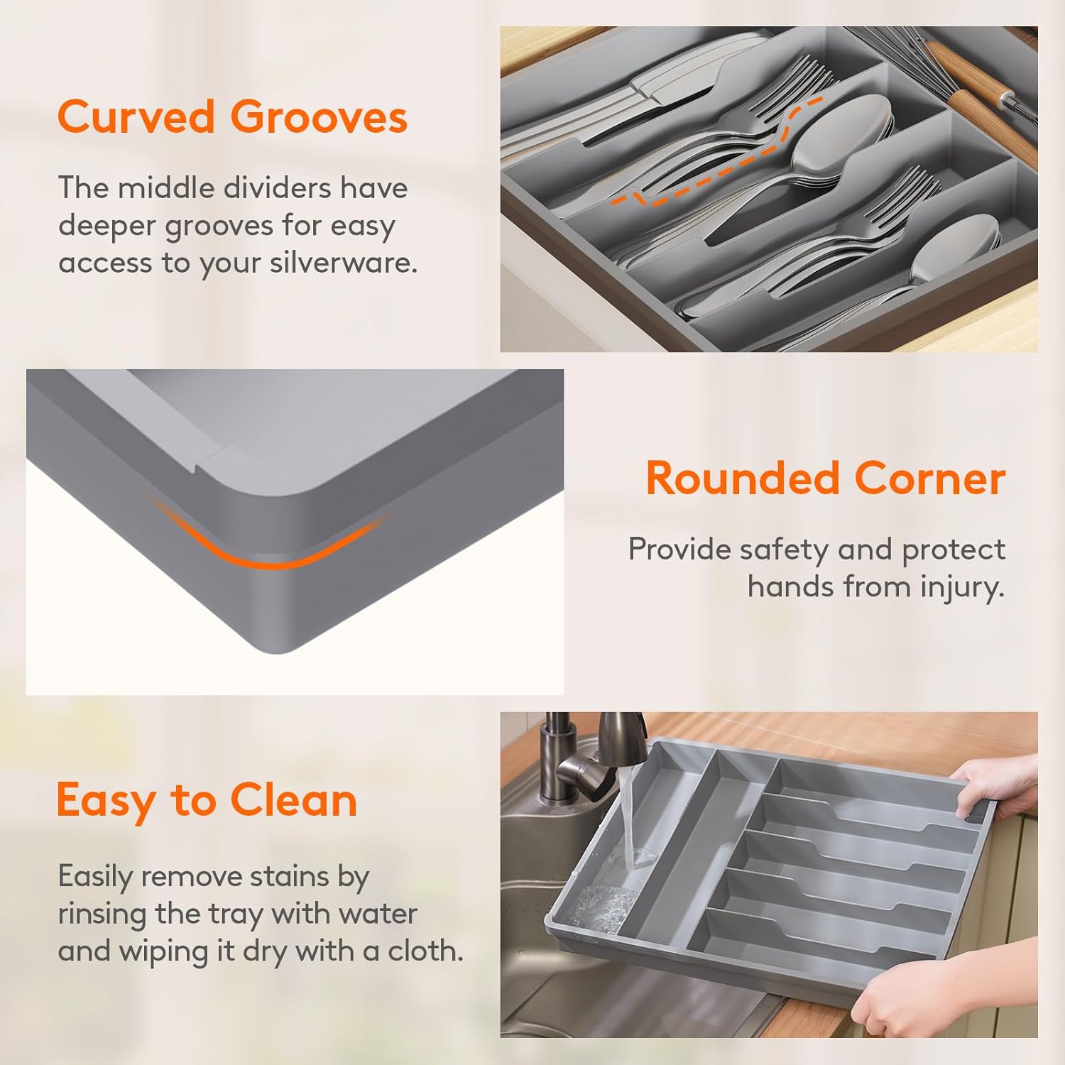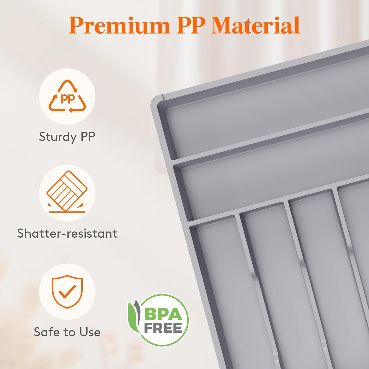 - Robust and Safe: This kitchen drawer organizer is crafted from premium PP material, BPA-free and built to last. It ensures your silverware is stored in a healthy, safe environment for worry-free use