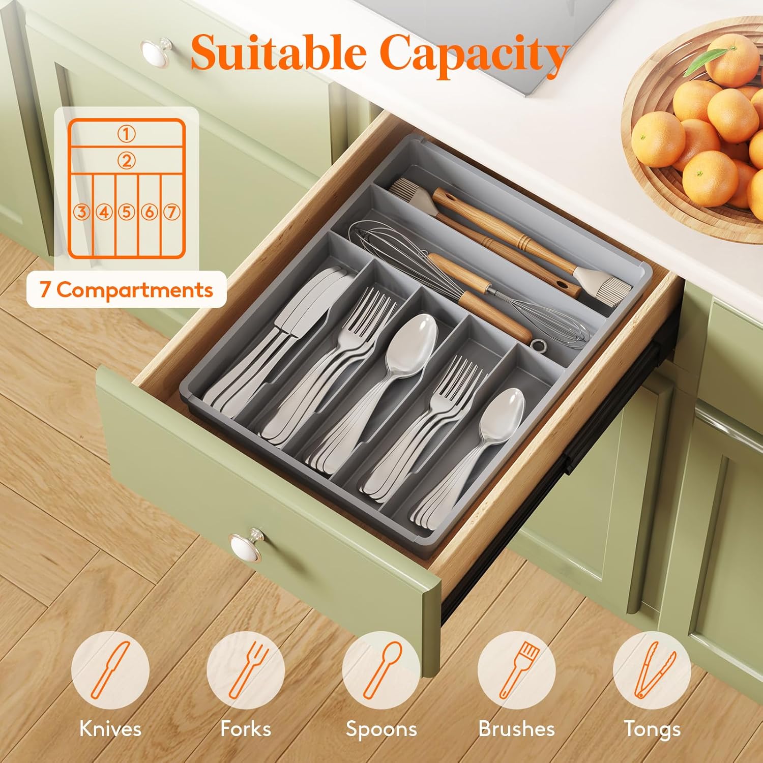 - Sort Your Silverware: The silverware tray comes with 7 compartments, creating more space in drawers for spoons, cutlery, and flatware. Streamline your cooking with a no-install organizer that keeps cutlery at your fingertips