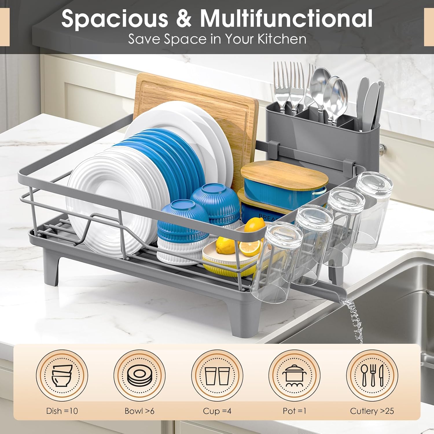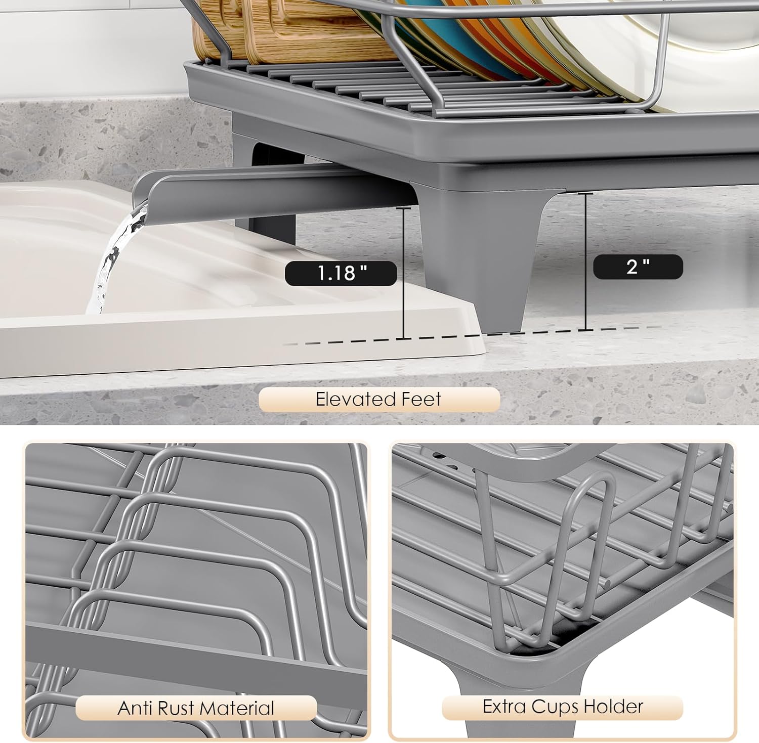 Dish Drying Rack for Kitchen Counter, Sink Dish Rack with Drainboard, Large Dish Drainer with Cups Holder, Home Countertop Plate Dryer Storage Rack with Cutlery Holder, Gray