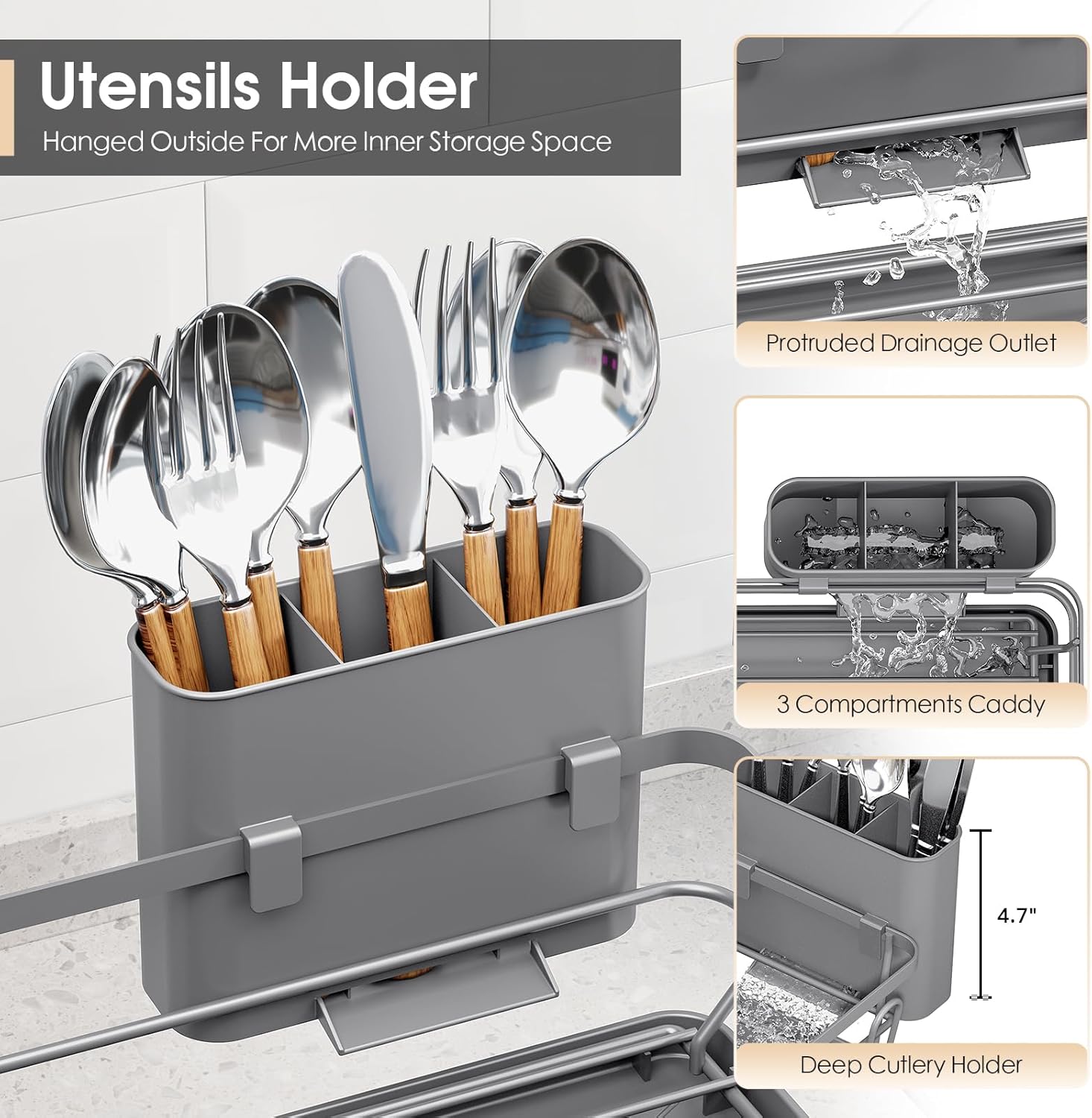 - [ 3-Grid Cutlery Holder ] Utensils holder hang outside the frame and lead water directly into the drainboard, save much inner storage space . Meanwhile, it divides into 3 compartments, stores 30 pcs of forks, knives and spoons separately