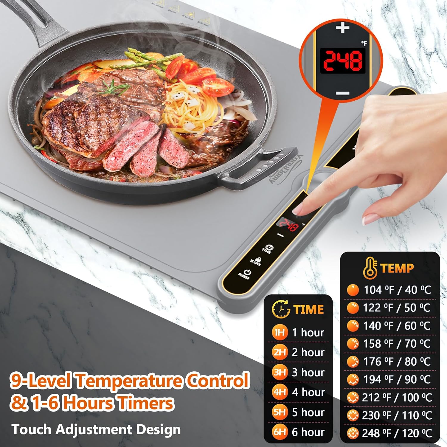 - 【9-Level Temperature Control & 1-6H Timers】This warming mat offers 9 temperature levels from 104℉-248℉, with precise temperature control to meet the heat preservation needs of different foods; The touch screen design allows you to easily adjust the gears and real-time display of the temperature, in addition, our warming tray is also equipped with a 1-6 hour timer function, so from now on, say goodbye to cold food and enjoy warm food, which brings a pleasant dining experience for you