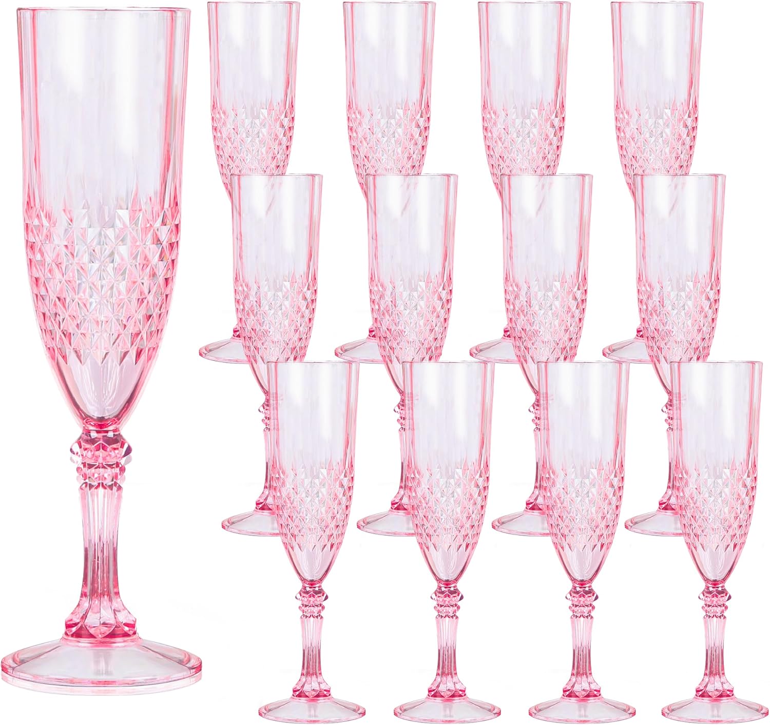 - Charming Set: Champagne flutes set include 12 retro-style pink champagne plastic wine glasses, providing ample quantity to meet your daily use and replacement needs. A suitable champagne cup is the icing on the cake. Plastic wine glasses not only carry the wine, but also carries the laughter and blessings